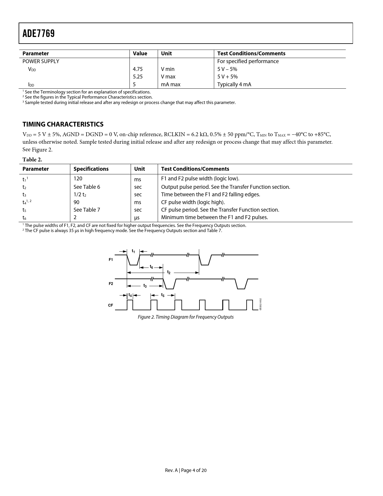 link to page 4 link to page 20 link to page 15 link to page 14 link to page 20 link to page 4 link to page 15 link to page 14 ADE7769Parameter ValueUnitTestConditions/Comments POWER SUPPLY For specified performance VDD 4.75 V min 5 V – 5% 5.25 V max 5 V + 5% IDD 5 mA max Typically 4 mA 1 See the Terminology section for an explanation of specifications. 2 See the figures in the Typical Performance Characteristics section. 3 Sample tested during initial release and after any redesign or process change that may affect this parameter. TIMING CHARACTERISTICS VDD = 5 V ± 5%, AGND = DGND = 0 V, on-chip reference, RCLKIN = 6.2 kΩ, 0.5% ± 50 ppm/°C, TMIN to TMAX = −40°C to +85°C, unless otherwise noted. Sample tested during initial release and after any redesign or process change that may affect this parameter. See Figure 2. Table 2.ParameterSpecificationsUnitTest Conditions/Comments t 1 1 120 ms F1 and F2 pulse width (logic low). t2 See Table 6 sec Output pulse period. See the Transfer Function section. t3 1/2 t2 sec Time between the F1 and F2 falling edges. t 1, 2 4 90 ms CF pulse width (logic high). t5 See Table 7 sec CF pulse period. See the Transfer Function section. t6 2 μs Minimum time between the F1 and F2 pulses. 1 The pulse widths of F1, F2, and CF are not fixed for higher output frequencies. See the Frequency Outputs section. 2 The CF pulse is always 35 μs in high frequency mode. See the Frequency Outputs section and Table 7. t1F1t6t2F2t3tt45CF 05332-002 Figure 2. Timing Diagram for Frequency Outputs Rev. A | Page 4 of 20 Document Outline FEATURES GENERAL DESCRIPTION FUNCTIONAL BLOCK DIAGRAM SPECIFICATIONS TIMING CHARACTERISTICS ABSOLUTE MAXIMUM RATINGS ESD CAUTION TERMINOLOGY PIN CONFIGURATION AND FUNCTION DESCRIPTIONS TYPICAL PERFORMANCE CHARACTERISTICS FUNCTIONAL DESCRIPTION THEORY OF OPERATION Power Factor Considerations Nonsinusoidal Voltage and Current ANALOG INPUTS Channel V1 (Current Channel) Channel V2 (Voltage Channel) Typical Connection Diagrams POWER SUPPLY MONITOR HPF and Offset Effects Digital-to-Frequency Conversion Connecting to a Microcontroller for Energy Measurement Power Measurement Considerations INTERNAL OSCILLATOR (OSC) TRANSFER FUNCTION Frequency Outputs F1 and F2 Example Frequency Output CF SELECTING A FREQUENCY FOR AN ENERGY METER APPLICATION Frequency Outputs NO-LOAD THRESHOLD NEGATIVE POWER INFORMATION EVALUATION BOARD AND REFERENCE DESIGN BOARD OUTLINE DIMENSIONS ORDERING GUIDE