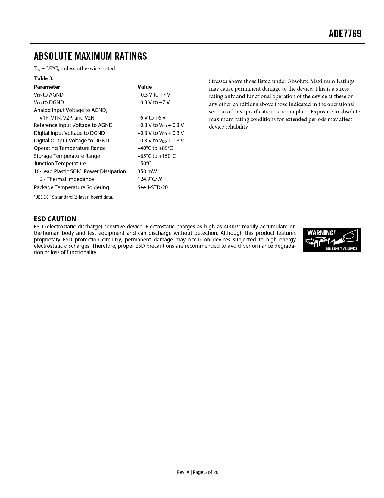 ADE7769. ABSOLUTE MAXIMUM RATINGS. Table 3. Parameter Value. ESD CAUTION