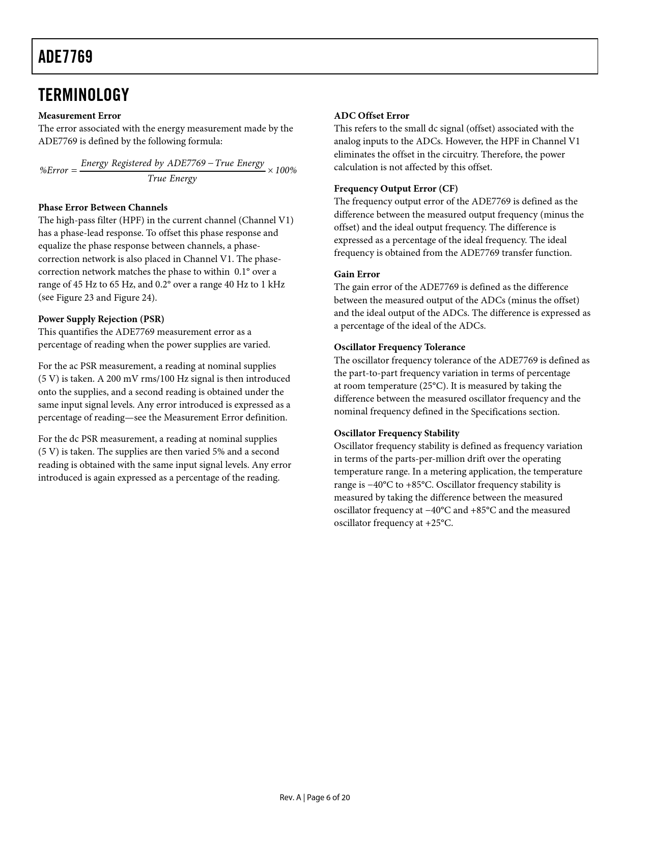 link to page 12 link to page 13 link to page 3 ADE7769TERMINOLOGY Measurement ErrorADC Offset Error The error associated with the energy measurement made by the This refers to the small dc signal (offset) associated with the ADE7769 is defined by the following formula: analog inputs to the ADCs. However, the HPF in Channel V1 eliminates the offset in the circuitry. Therefore, the power Energy Registered by ADE7769 − True Energy %Error = × 100% calculation is not affected by this offset. True Energy Frequency Output Error (CF) The frequency output error of the ADE7769 is defined as the Phase Error Between Channels difference between the measured output frequency (minus the The high-pass filter (HPF) in the current channel (Channel V1) offset) and the ideal output frequency. The difference is has a phase-lead response. To offset this phase response and expressed as a percentage of the ideal frequency. The ideal equalize the phase response between channels, a phase- frequency is obtained from the ADE7769 transfer function. correction network is also placed in Channel V1. The phase- correction network matches the phase to within 0.1° over a Gain Error range of 45 Hz to 65 Hz, and 0.2° over a range 40 Hz to 1 kHz The gain error of the ADE7769 is defined as the difference (see Figure 23 and Figure 24). between the measured output of the ADCs (minus the offset) and the ideal output of the ADCs. The difference is expressed as Power Supply Rejection (PSR) a percentage of the ideal of the ADCs. This quantifies the ADE7769 measurement error as a percentage of reading when the power supplies are varied. Oscillator Frequency Tolerance The oscillator frequency tolerance of the ADE7769 is defined as For the ac PSR measurement, a reading at nominal supplies the part-to-part frequency variation in terms of percentage (5 V) is taken. A 200 mV rms/100 Hz signal is then introduced at room temperature (25°C). It is measured by taking the onto the supplies, and a second reading is obtained under the difference between the measured oscillator frequency and the same input signal levels. Any error introduced is expressed as a nominal frequency defined in the Specifications section. percentage of reading—see the Measurement Error definition. Oscillator Frequency Stability For the dc PSR measurement, a reading at nominal supplies Oscillator frequency stability is defined as frequency variation (5 V) is taken. The supplies are then varied 5% and a second in terms of the parts-per-million drift over the operating reading is obtained with the same input signal levels. Any error temperature range. In a metering application, the temperature introduced is again expressed as a percentage of the reading. range is −40°C to +85°C. Oscillator frequency stability is measured by taking the difference between the measured oscillator frequency at −40°C and +85°C and the measured oscillator frequency at +25°C. Rev. A | Page 6 of 20 Document Outline FEATURES GENERAL DESCRIPTION FUNCTIONAL BLOCK DIAGRAM SPECIFICATIONS TIMING CHARACTERISTICS ABSOLUTE MAXIMUM RATINGS ESD CAUTION TERMINOLOGY PIN CONFIGURATION AND FUNCTION DESCRIPTIONS TYPICAL PERFORMANCE CHARACTERISTICS FUNCTIONAL DESCRIPTION THEORY OF OPERATION Power Factor Considerations Nonsinusoidal Voltage and Current ANALOG INPUTS Channel V1 (Current Channel) Channel V2 (Voltage Channel) Typical Connection Diagrams POWER SUPPLY MONITOR HPF and Offset Effects Digital-to-Frequency Conversion Connecting to a Microcontroller for Energy Measurement Power Measurement Considerations INTERNAL OSCILLATOR (OSC) TRANSFER FUNCTION Frequency Outputs F1 and F2 Example Frequency Output CF SELECTING A FREQUENCY FOR AN ENERGY METER APPLICATION Frequency Outputs NO-LOAD THRESHOLD NEGATIVE POWER INFORMATION EVALUATION BOARD AND REFERENCE DESIGN BOARD OUTLINE DIMENSIONS ORDERING GUIDE