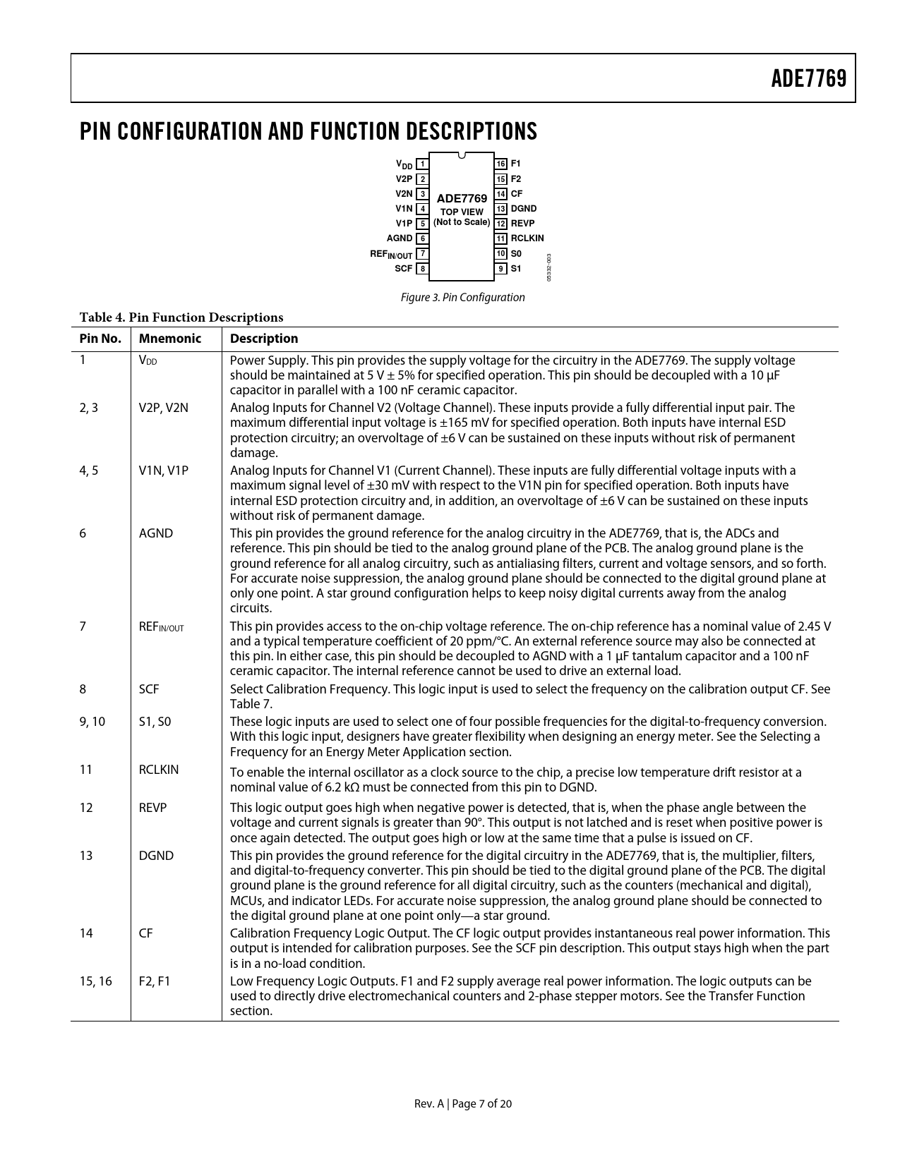 link to page 15 link to page 14 ADE7769PIN CONFIGURATION AND FUNCTION DESCRIPTIONSVDD 116 F1V2P215 F2V2N314 CFADE7769V1N413 DGNDTOP VIEWV1P5(Not to Scale) 12 REVPAGND611 RCLKINREFIN/OUT 710 S0SCF89S1 05332-003 Figure 3. Pin Configuration Table 4. Pin Function DescriptionsPin No.MnemonicDescription 1 VDD Power Supply. This pin provides the supply voltage for the circuitry in the ADE7769. The supply voltage should be maintained at 5 V ± 5% for specified operation. This pin should be decoupled with a 10 μF capacitor in parallel with a 100 nF ceramic capacitor. 2, 3 V2P, V2N Analog Inputs for Channel V2 (Voltage Channel). These inputs provide a fully differential input pair. The maximum differential input voltage is ±165 mV for specified operation. Both inputs have internal ESD protection circuitry; an overvoltage of ±6 V can be sustained on these inputs without risk of permanent damage. 4, 5 V1N, V1P Analog Inputs for Channel V1 (Current Channel). These inputs are fully differential voltage inputs with a maximum signal level of ±30 mV with respect to the V1N pin for specified operation. Both inputs have internal ESD protection circuitry and, in addition, an overvoltage of ±6 V can be sustained on these inputs without risk of permanent damage. 6 AGND This pin provides the ground reference for the analog circuitry in the ADE7769, that is, the ADCs and reference. This pin should be tied to the analog ground plane of the PCB. The analog ground plane is the ground reference for all analog circuitry, such as antialiasing filters, current and voltage sensors, and so forth. For accurate noise suppression, the analog ground plane should be connected to the digital ground plane at only one point. A star ground configuration helps to keep noisy digital currents away from the analog circuits. 7 REFIN/OUT This pin provides access to the on-chip voltage reference. The on-chip reference has a nominal value of 2.45 V and a typical temperature coefficient of 20 ppm/°C. An external reference source may also be connected at this pin. In either case, this pin should be decoupled to AGND with a 1 μF tantalum capacitor and a 100 nF ceramic capacitor. The internal reference cannot be used to drive an external load. 8 SCF Select Calibration Frequency. This logic input is used to select the frequency on the calibration output CF. See Table 7. 9, 10 S1, S0 These logic inputs are used to select one of four possible frequencies for the digital-to-frequency conversion. With this logic input, designers have greater flexibility when designing an energy meter. See the Selecting a Frequency for an Energy Meter Application section. 11 RCLKIN To enable the internal oscillator as a clock source to the chip, a precise low temperature drift resistor at a nominal value of 6.2 kΩ must be connected from this pin to DGND. 12 REVP This logic output goes high when negative power is detected, that is, when the phase angle between the voltage and current signals is greater than 90°. This output is not latched and is reset when positive power is once again detected. The output goes high or low at the same time that a pulse is issued on CF. 13 DGND This pin provides the ground reference for the digital circuitry in the ADE7769, that is, the multiplier, filters, and digital-to-frequency converter. This pin should be tied to the digital ground plane of the PCB. The digital ground plane is the ground reference for all digital circuitry, such as the counters (mechanical and digital), MCUs, and indicator LEDs. For accurate noise suppression, the analog ground plane should be connected to the digital ground plane at one point only—a star ground. 14 CF Calibration Frequency Logic Output. The CF logic output provides instantaneous real power information. This output is intended for calibration purposes. See the SCF pin description. This output stays high when the part is in a no-load condition. 15, 16 F2, F1 Low Frequency Logic Outputs. F1 and F2 supply average real power information. The logic outputs can be used to directly drive electromechanical counters and 2-phase stepper motors. See the Transfer Function section. Rev. A | Page 7 of 20 Document Outline FEATURES GENERAL DESCRIPTION FUNCTIONAL BLOCK DIAGRAM SPECIFICATIONS TIMING CHARACTERISTICS ABSOLUTE MAXIMUM RATINGS ESD CAUTION TERMINOLOGY PIN CONFIGURATION AND FUNCTION DESCRIPTIONS TYPICAL PERFORMANCE CHARACTERISTICS FUNCTIONAL DESCRIPTION THEORY OF OPERATION Power Factor Considerations Nonsinusoidal Voltage and Current ANALOG INPUTS Channel V1 (Current Channel) Channel V2 (Voltage Channel) Typical Connection Diagrams POWER SUPPLY MONITOR HPF and Offset Effects Digital-to-Frequency Conversion Connecting to a Microcontroller for Energy Measurement Power Measurement Considerations INTERNAL OSCILLATOR (OSC) TRANSFER FUNCTION Frequency Outputs F1 and F2 Example Frequency Output CF SELECTING A FREQUENCY FOR AN ENERGY METER APPLICATION Frequency Outputs NO-LOAD THRESHOLD NEGATIVE POWER INFORMATION EVALUATION BOARD AND REFERENCE DESIGN BOARD OUTLINE DIMENSIONS ORDERING GUIDE