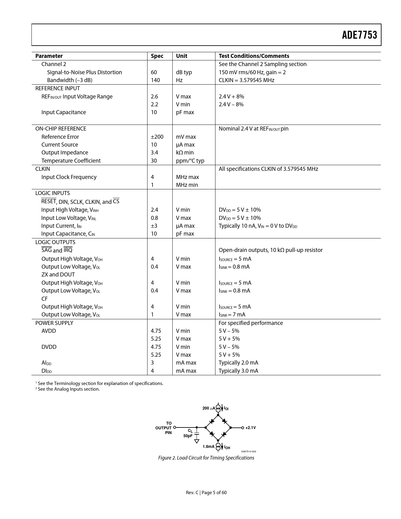 Channel 2 See the Channel 2 Sampling section Signal-to-Noise Plus Distortion 60 dB typ 150 mV rms/60 Hz, gain = 2 Bandwidth (–3 dB) 140 Hz CLKIN = 3.579545 MHz REFERENCE INPUT REFIN/OUT Input Voltage Range 2.6 V max 2.4 V + 8% 2.2 V min 2.4 V – 8% Input Capacitance 10 pF max ON-CHIP REFERENCE Nominal 2.4 V at REFIN/OUT pin Reference Error ±200 mV max Current Source 10 μA max Output Impedance 3.4 kΩ min Temperature Coefficient 30 ppm/°C typ CLKIN All specifications CLKIN of 3.579545 MHz Input Clock Frequency 4 MHz max 1 MHz min LOGIC INPUTS RESET, DIN, SCLK, CLKIN, and CS Input High Voltage, VINH 2.4 V min DVDD = 5 V ± 10% Input Low Voltage, VINL 0.8 V max DVDD = 5 V ± 10% Input Current, IIN ±3 μA max Typically 10 nA, VIN = 0 V to DVDD Input Capacitance, CIN 10 pF max LOGIC OUTPUTS SAG and IRQ Open-drain outputs, 10 kΩ pull-up resistor Output High Voltage, VOH 4 V min ISOURCE = 5 mA Output Low Voltage, VOL 0.4 V max ISINK = 0.8 mA ZX and DOUT Output High Voltage, VOH 4 V min ISOURCE = 5 mA Output Low Voltage, VOL 0.4 V max ISINK = 0.8 mA CF Output High Voltage, VOH 4 V min ISOURCE = 5 mA Output Low Voltage, VOL 1 V max ISINK = 7 mA POWER SUPPLY For specified performance AVDD 4.75 V min 5 V – 5% 5.25 V max 5 V + 5% DVDD 4.75 V min 5 V – 5% 5.25 V max 5 V + 5% AIDD 3 mA max Typically 2.0 mA DIDD 4 mA max Typically 3.0 mA 1 See the Terminology section for explanation of specifications. 2 See the Analog Inputs section.