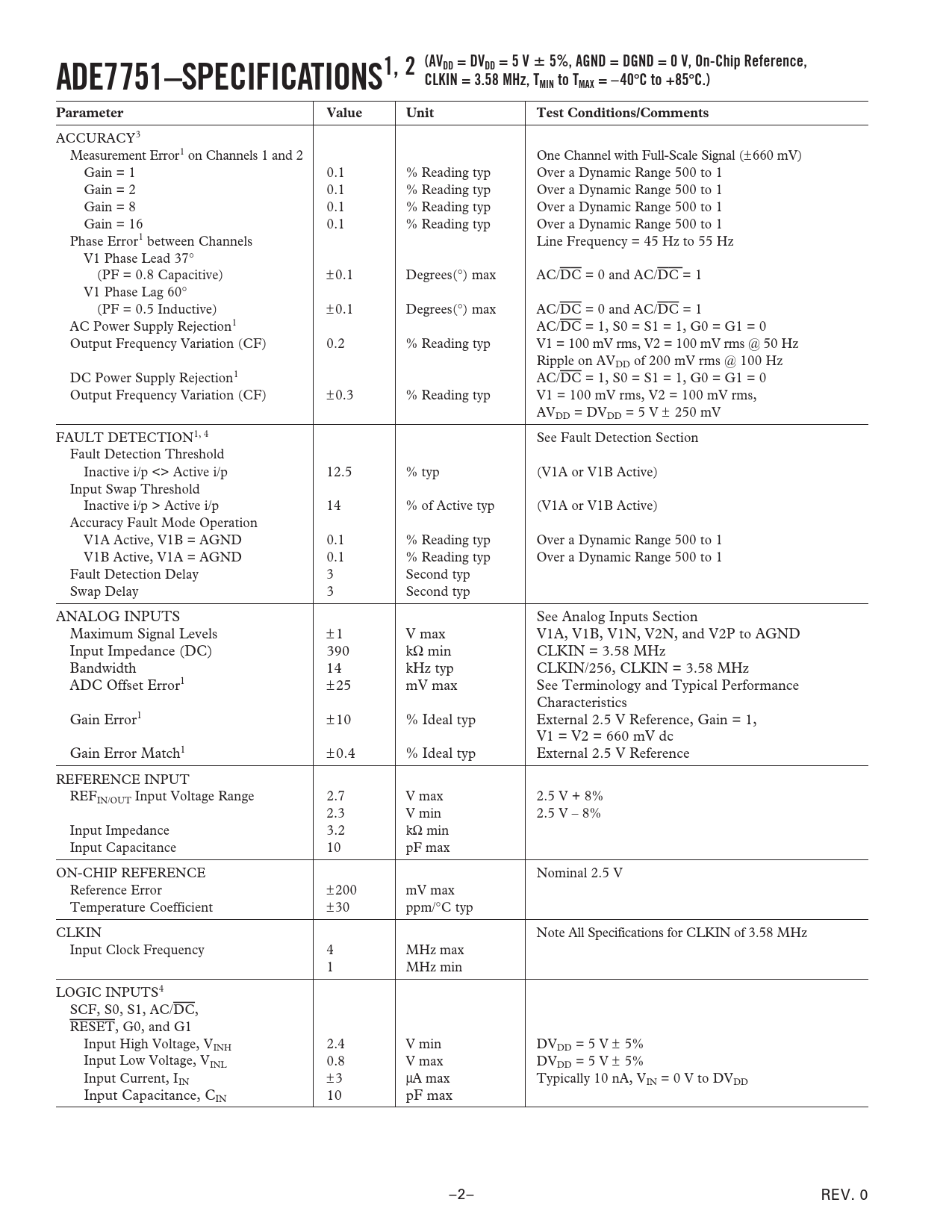 ADE7751–SPECIFICATIONS1, 2 (AVDD = DVDD = 5 V ⴞ 5%, AGND = DGND = 0 V, On-Chip Reference,CLKIN = 3.58 MHz, TMIN to TMAX = –40 ⴗ C to +85 ⴗ C.)ParameterValueUnitTest Conditions/Comments ACCURACY3 Measurement Error1 on Channels 1 and 2 One Channel with Full-Scale Signal (±660 mV) Gain = 1 0.1 % Reading typ Over a Dynamic Range 500 to 1 Gain = 2 0.1 % Reading typ Over a Dynamic Range 500 to 1 Gain = 8 0.1 % Reading typ Over a Dynamic Range 500 to 1 Gain = 16 0.1 % Reading typ Over a Dynamic Range 500 to 1 Phase Error1 between Channels Line Frequency = 45 Hz to 55 Hz V1 Phase Lead 37° (PF = 0.8 Capacitive) ±0.1 Degrees(°) max AC/DC = 0 and AC/DC = 1 V1 Phase Lag 60° (PF = 0.5 Inductive) ±0.1 Degrees(°) max AC/DC = 0 and AC/DC = 1 AC Power Supply Rejection1 AC/DC = 1, S0 = S1 = 1, G0 = G1 = 0 Output Frequency Variation (CF) 0.2 % Reading typ V1 = 100 mV rms, V2 = 100 mV rms @ 50 Hz Ripple on AVDD of 200 mV rms @ 100 Hz DC Power Supply Rejection1 AC/DC = 1, S0 = S1 = 1, G0 = G1 = 0 Output Frequency Variation (CF) ±0.3 % Reading typ V1 = 100 mV rms, V2 = 100 mV rms, AVDD = DVDD = 5 V ± 250 mV FAULT DETECTION1, 4 See Fault Detection Section Fault Detection Threshold Inactive i/p <> Active i/p 12.5 % typ (V1A or V1B Active) Input Swap Threshold Inactive i/p > Active i/p 14 % of Active typ (V1A or V1B Active) Accuracy Fault Mode Operation V1A Active, V1B = AGND 0.1 % Reading typ Over a Dynamic Range 500 to 1 V1B Active, V1A = AGND 0.1 % Reading typ Over a Dynamic Range 500 to 1 Fault Detection Delay 3 Second typ Swap Delay 3 Second typ ANALOG INPUTS See Analog Inputs Section Maximum Signal Levels ±1 V max V1A, V1B, V1N, V2N, and V2P to AGND Input Impedance (DC) 390 kΩ min CLKIN = 3.58 MHz Bandwidth 14 kHz typ CLKIN/256, CLKIN = 3.58 MHz ADC Offset Error1 ±25 mV max See Terminology and Typical Performance Characteristics Gain Error1 ±10 % Ideal typ External 2.5 V Reference, Gain = 1, V1 = V2 = 660 mV dc Gain Error Match1 ±0.4 % Ideal typ External 2.5 V Reference REFERENCE INPUT REFIN/OUT Input Voltage Range 2.7 V max 2.5 V + 8% 2.3 V min 2.5 V – 8% Input Impedance 3.2 kΩ min Input Capacitance 10 pF max ON-CHIP REFERENCE Nominal 2.5 V Reference Error ±200 mV max Temperature Coefficient ±30 ppm/°C typ CLKIN Note All Specifications for CLKIN of 3.58 MHz Input Clock Frequency 4 MHz max 1 MHz min LOGIC INPUTS4 SCF, S0, S1, AC/DC, RESET, G0, and G1 Input High Voltage, VINH 2.4 V min DVDD = 5 V ± 5% Input Low Voltage, VINL 0.8 V max DVDD = 5 V ± 5% Input Current, I ± IN 3 µA max Typically 10 nA, VIN = 0 V to DVDD Input Capacitance, CIN 10 pF max –2– REV. 0