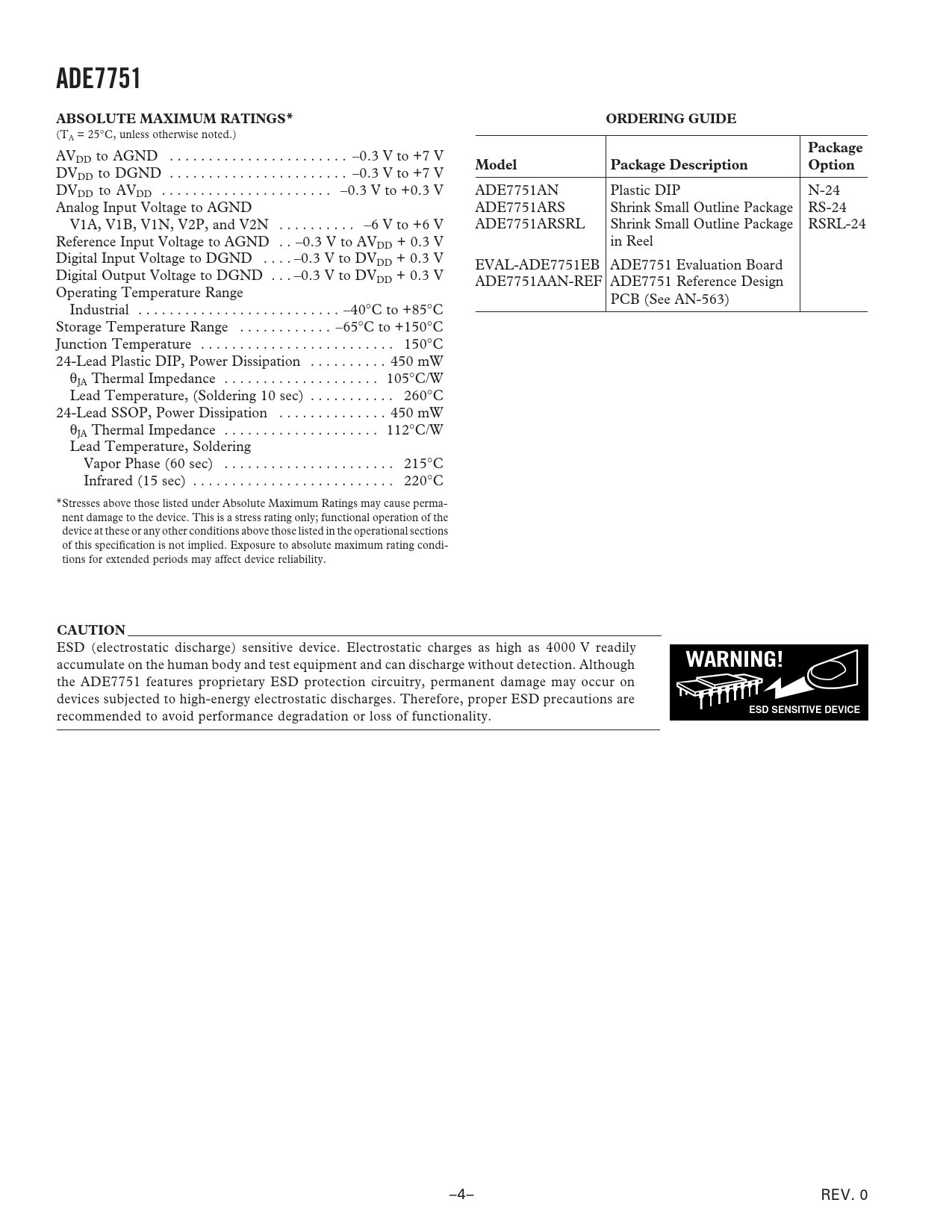ADE7751. ABSOLUTE MAXIMUM RATINGS*. ORDERING GUIDE. Package. Model. Package Description. Option. CAUTION. WARNING!. ESD SENSITIVE DEVICE