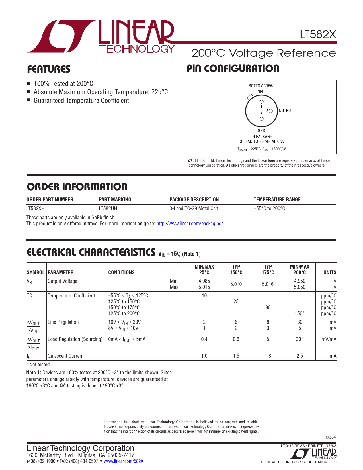 LT582X 200°C Voltage Reference FEATURESPin conFigURATion n 100% Tested at 200°C BOTTOM VIEW n Absolute Maximum Operating Temperature: 225°C INPUT n Guaranteed Temperature Coefficient 1 2 OUTPUT 3 GND H PACKAGE 3-LEAD TO-39 METAL CAN TJMAX = 225°C, θJA = 150°C/W L, LT, LTC, LTM, Linear Technology and the Linear logo are registered trademarks of Linear Technology Corporation. All other trademarks are the property of their respective owners. oRdER inFoRmATionORDER PART NUMBERPART MARKINGPACKAGE DESCRIPTIONTEMPERATURE RANGE LT582XH LT582UH 3-Lead TO-39 Metal Can –55°C to 200°C These parts are only available in SnPb finish. This product is only offered in trays. For more information go to: http://www.linear.com/packaging/ ElEcTRicAl chARAcTERiSTicS VIN = 15V, (Note 1)MIN/MAXTYPTYPMIN/MAXSYMBOL PARAMETERCONDITIONS25°C150°C175°C200°CUNITS VR Output Voltage Min 4.985 V Max 5.015 5.010 5.016 4.950 5.050 V TC Temperature Coefficient –55°C ≤ TA ≤ 125°C 10 ppm/°C 125°C to 150°C 25 ppm/°C 150°C to 175°C 90 ppm/°C 125°C to 200°C 150* ppm/°C ∆VOUT Line Regulation 10V ≤ VIN ≤ 30V 2 6 8 30 mV ∆V 8V ≤ V 1 2 3 5 mV IN IN ≤ 10V ∆VOUT Load Regulation (Sourcing) 0mA ≤ IOUT ≤ 5mA 0.4 0.6 5 30* mV/mA ∆IOUT IQ Quiescent Current 1.0 1.5 1.8 2.5 mA *Not tested Note 1: Devices are 100% tested at 200°C ±3° to the limits shown. Since parameters change rapidly with temperature, devices are guaranteed at 190°C ±3°C and QA testing is done at 190°C ±3°. Information furnished by Linear Technology Corporation is believed to be accurate and reliable. However, no responsibility is assumed for its use. Linear Technology Corporation makes no representa- tion that the interconnection of its circuits as described herein will not infringe on existing patent rights. 582xfa Linear Technology Corporation LT 0113 REV A • PRINTED IN USA 1630 McCarthy Blvd., Milpitas, CA 95035-7417 (408) 432-1900 ● FAX: (408) 434-0507 ● www.linear.com/582X LINEAR TECHNOLOGY CORPORATION 2008 Document Outline Features Pin Configuration Order Information Electrical Characteristics