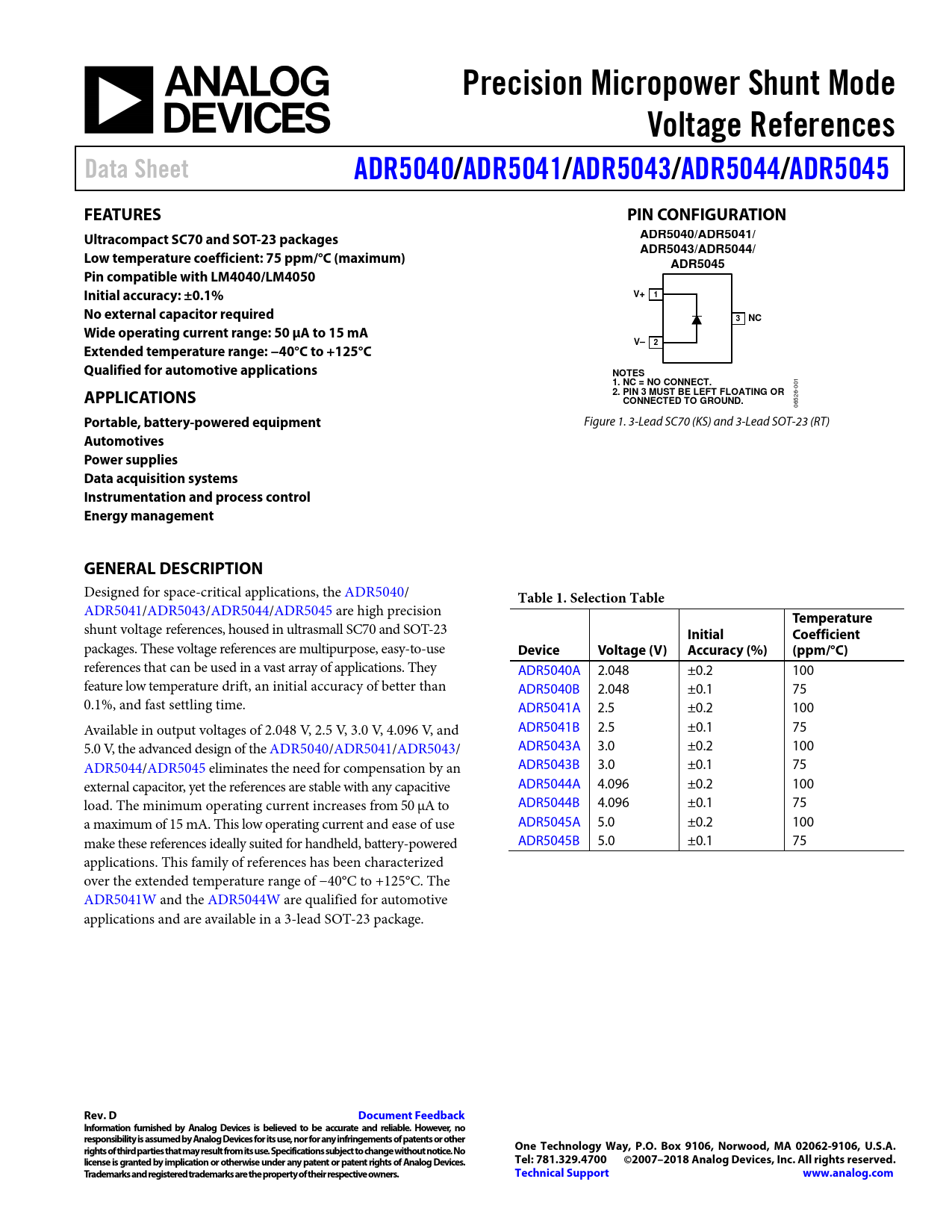 Precision Micropower Shunt Mode. Voltage References. Data Sheet. ADR5040/. ADR5041. /ADR5043. /ADR5044/. ADR5045. FEATURES