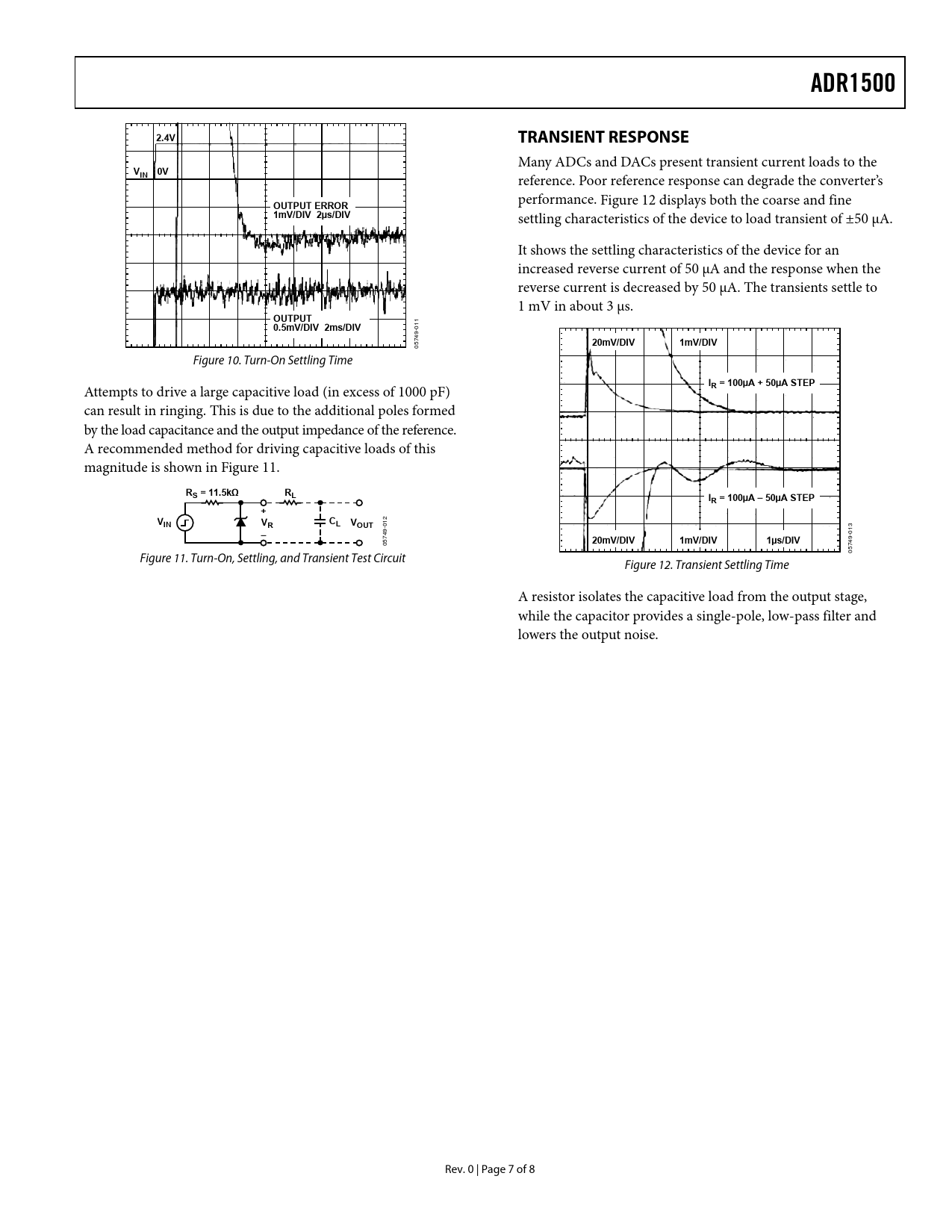 link to page 7 link to page 7 ADR15002.4VTRANSIENT RESPONSE Many ADCs and DACs present transient current loads to the V0VIN reference. Poor reference response can degrade the converter’s OUTPUT ERROR performance. Figure 12 displays both the coarse and fine 1mV/DIV 2µs/DIV settling characteristics of the device to load transient of ±50 μA. It shows the settling characteristics of the device for an increased reverse current of 50 μA and the response when the reverse current is decreased by 50 μA. The transients settle to 1 mV in about 3 μs. OUTPUT 11 0 0.5mV/DIV 2ms/DIV 9- 574 20mV/DIV1mV/DIV 0 Figure 10. Turn-On Settling Time IR = 100µA + 50µA STEP Attempts to drive a large capacitive load (in excess of 1000 pF) can result in ringing. This is due to the additional poles formed by the load capacitance and the output impedance of the reference. A recommended method for driving capacitive loads of this magnitude is shown in Figure 11. RS = 11.5kΩRLIR = 100µA – 50µA STEP+VINVRCL VOUT -012 13 49 – 0 9- 20mV/DIV1mV/DIV1µs/DIV 057 574 0 Figure 11. Turn-On, Settling, and Transient Test Circuit Figure 12. Transient Settling Time A resistor isolates the capacitive load from the output stage, while the capacitor provides a single-pole, low-pass filter and lowers the output noise. Rev. 0 | Page 7 of 8 Document Outline FEATURES APPLICATIONS GENERAL DESCRIPTION PIN CONFIGURATION TABLE OF CONTENTS REVISION HISTORY SPECIFICATIONS ELECTRICAL CHARACTERISTICS ABSOLUTE MAXIMUM RATINGS ESD CAUTION TYPICAL PERFORMANCE CHARACTERISTICS THEORY OF OPERATION APPLYING THE ADR1500 TURN-ON TIME TRANSIENT RESPONSE OUTLINE DIMENSIONS ORDERING GUIDE