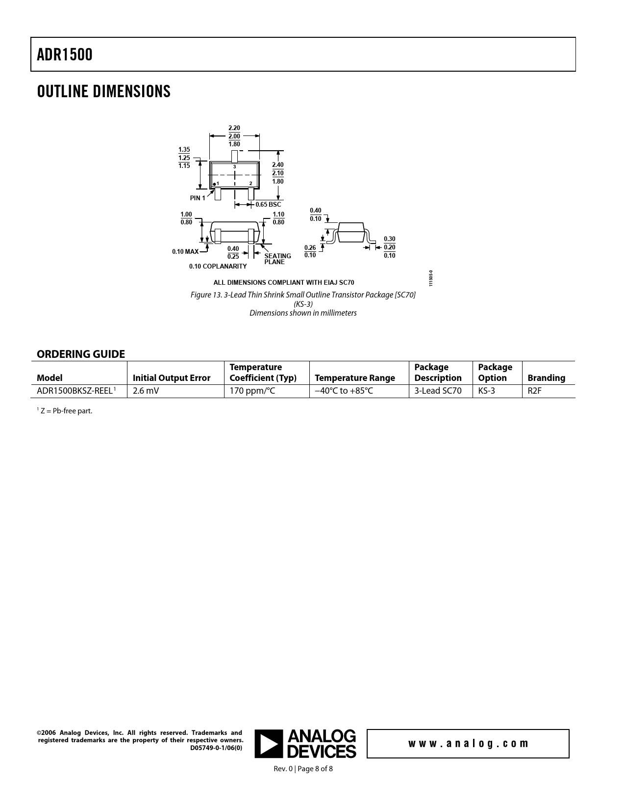 ADR1500 OUTLINE DIMENSIONS 2.20 2.00 1.80 1.35 1.25 1.15 3 2.40 2.10 1 2 1.80 PIN 1 0.65 BSC 0.40 1.00 1.10 0.10 0.80 0.80 0.30 0.40 0.26 0.20 0.10 MAX 0.25 SEATING 0.10 0.10 PLANE 0.10 COPLANARITY -0 05 ALL DIMENSIONS COMPLIANT WITH EIAJ SC70 1115