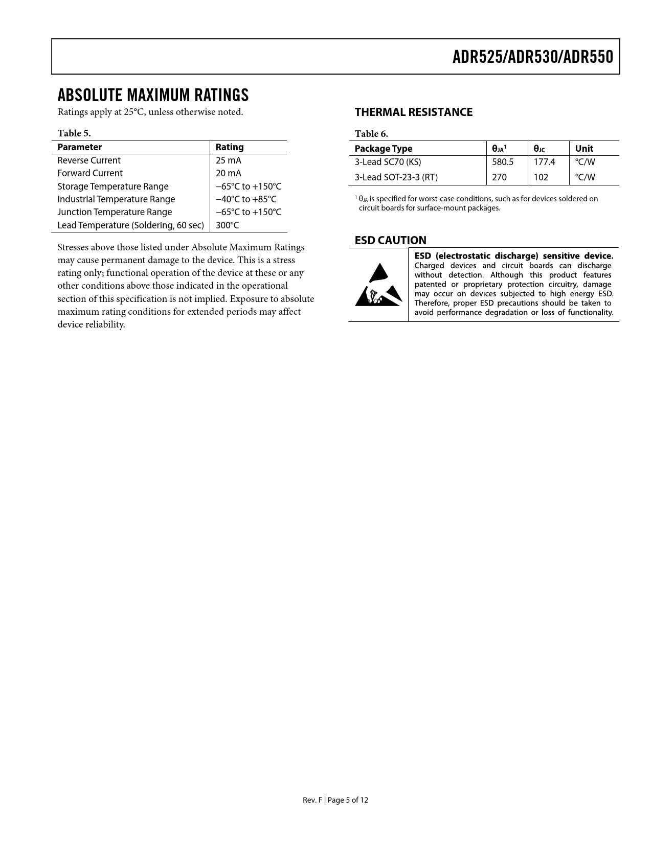 link to page 5 ADR525/ADR530/ADR550ABSOLUTE MAXIMUM RATINGS Ratings apply at 25°C, unless otherwise noted. THERMAL RESISTANCETable 5.Table 6.Parameter Rating Package Typeθ 1JAθJC Unit Reverse Current 25 mA 3-Lead SC70 (KS) 580.5 177.4 °C/W Forward Current 20 mA 3-Lead SOT-23-3 (RT) 270 102 °C/W Storage Temperature Range −65°C to +150°C Industrial Temperature Range −40°C to +85°C 1 θJA is specified for worst-case conditions, such as for devices soldered on Junction Temperature Range −65°C to +150°C circuit boards for surface-mount packages. Lead Temperature (Soldering, 60 sec) 300°C ESD CAUTION Stresses above those listed under Absolute Maximum Ratings may cause permanent damage to the device. This is a stress rating only; functional operation of the device at these or any other conditions above those indicated in the operational section of this specification is not implied. Exposure to absolute maximum rating conditions for extended periods may affect device reliability. Rev. F | Page 5 of 12 Document Outline FEATURES APPLICATIONS PIN CONFIGURATION GENERAL DESCRIPTION TABLE OF CONTENTS REVISION HISTORY SPECIFICATIONS ADR525 ELECTRICAL CHARACTERISTICS ADR530 ELECTRICAL CHARACTERISTICS ADR550 ELECTRICAL CHARACTERISTICS ABSOLUTE MAXIMUM RATINGS THERMAL RESISTANCE ESD CAUTION PARAMETER DEFINITIONS TEMPERATURE COEFFICIENT THERMAL HYSTERESIS TYPICAL PERFORMANCE CHARACTERISTICS THEORY OF OPERATION APPLICATIONS Precision Negative Voltage Reference Output Voltage Trim Stacking the ADR525/ADR530/ADR550 for User-Definable Outputs Adjustable Precision Voltage Source OUTLINE DIMENSIONS ORDERING GUIDE