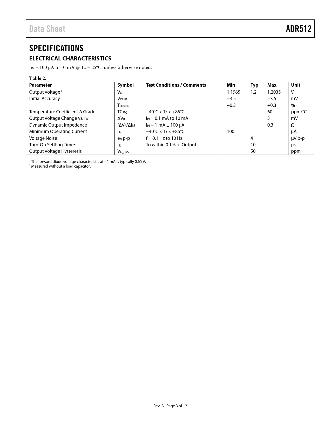 Páginas / Página12 / 3 — Data Sheet. ADR512. SPECIFICATIONS ELECTRICAL CHARACTERISTICS. Table 2. …