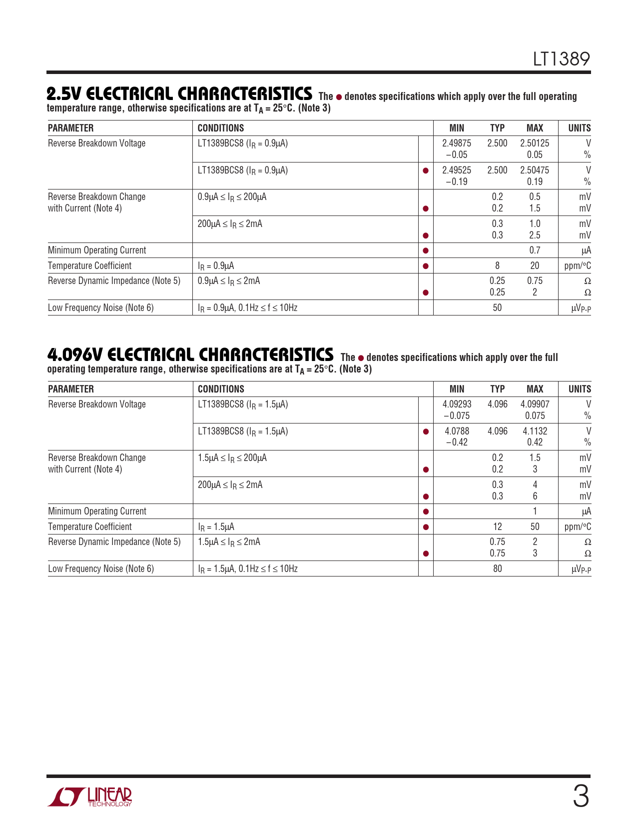 Reverse Breakdown Voltage LT1389BCS8 (IR = 1.5µA) 4.09293 4.096 4.09907 V – 0.075 0.075 % LT1389BCS8 (IR = 1.5µA) ● 4.0788 4.096 4.1132 V – 0.42 0.42 % Reverse Breakdown Change 1.5µA ≤ IR ≤ 200µA 0.2 1.5 mV with Current (Note 4) ● 0.2 3 mV 200µA ≤ IR ≤ 2mA 0.3 4 mV ● 0.3 6 mV Minimum Operating Current ● 1 µA Temperature Coefficient IR = 1.5µA ● 12 50 ppm/°C Reverse Dynamic Impedance (Note 5) 1.5µA ≤ IR ≤ 2mA 0.75 2 Ω ● 0.75 3 Ω Low Frequency Noise (Note 6) IR = 1.5µA, 0.1Hz ≤ f ≤ 10Hz 80 µVP-P 3