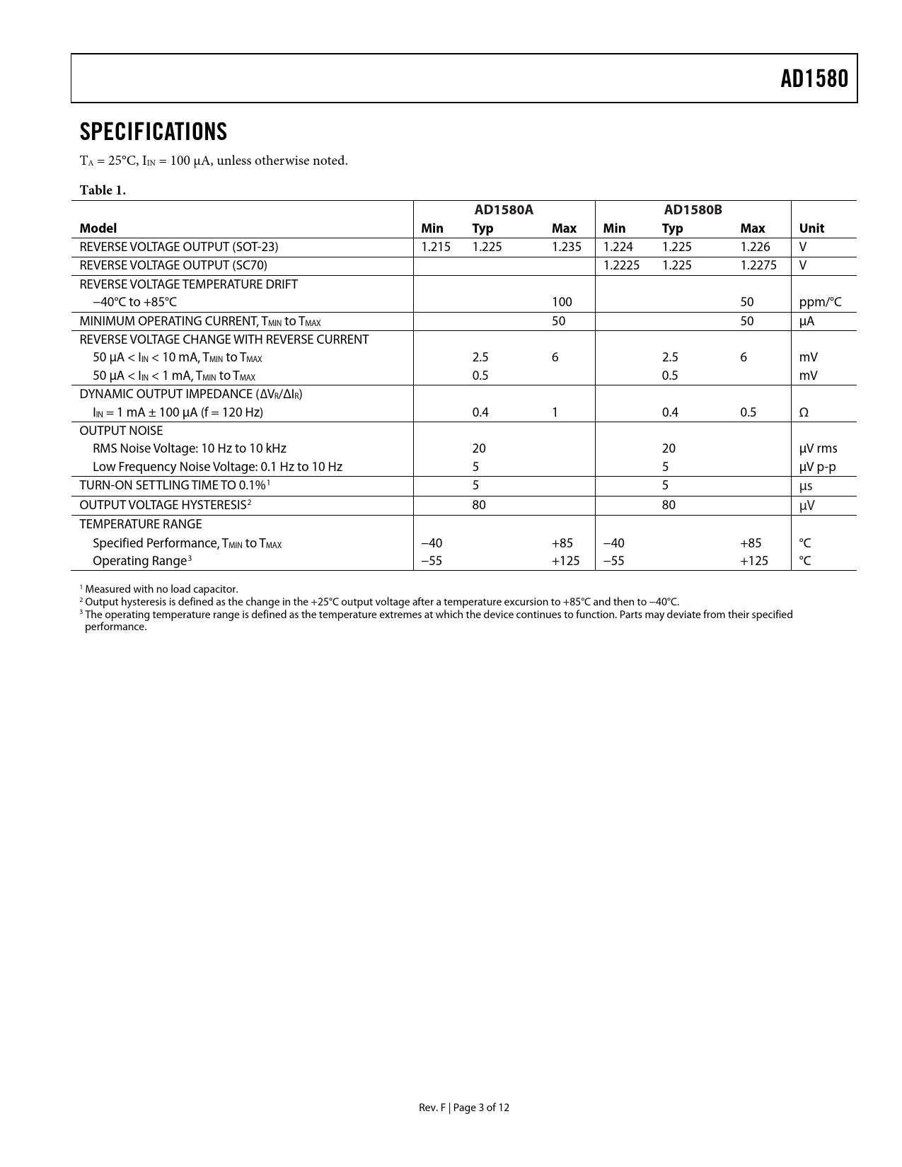 Páginas / Página12 / 3 — AD1580. SPECIFICATIONS. Table 1. AD1580A. AD1580B. Model. Min. Typ. Max. …