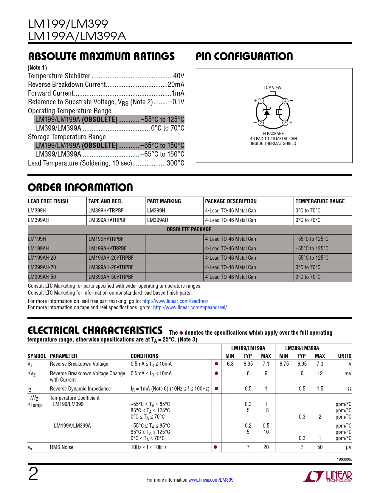 LM199H LM199H#TRPBF 4-Lead TO-46 Metal Can –55°C to 125°C LM199AH LM199AH#TRPBF 4-Lead TO-46 Metal Can –55°C to 125°C LM199AH-20 LM199AH-20#TRPBF 4-Lead TO-46 Metal Can –55°C to 125°C LM399AH-20 LM399AH-20#TRPBF 4-Lead TO-46 Metal Can 0°C to 70°C LM399AH-50 LM399AH-50#TRPBF 4-Lead TO-46 Metal Can 0°C to 70°C Consult LTC Marketing for parts specified with wider operating temperature ranges. Consult LTC Marketing for information on nonstandard lead based finish parts. For more information on lead free part marking, go to: http://www.linear.com/leadfree/ For more information on tape and reel specifications, go to: http://www.linear.com/tapeandreel/