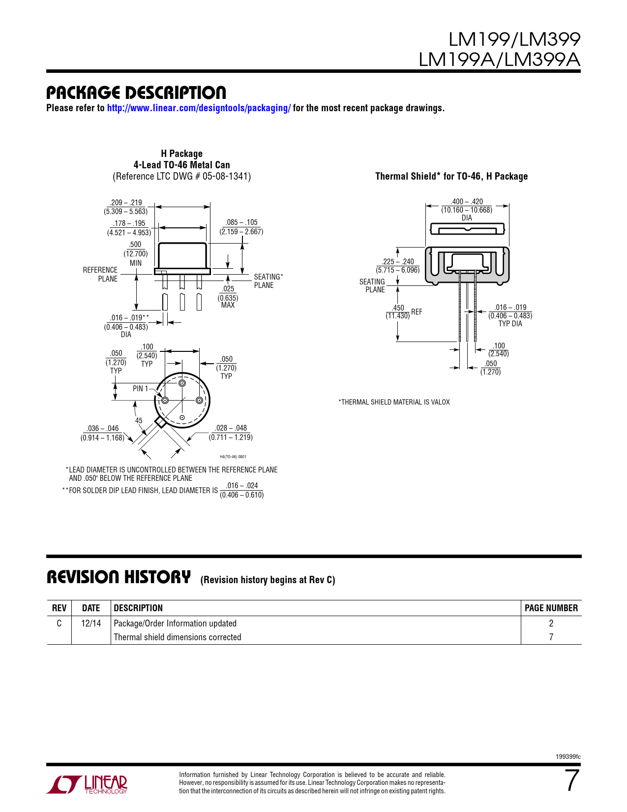 C 12/14 Package/Order Information updated 2 Thermal shield dimensions corrected 7 199399fc Information furnished by Linear Technology Corporation is believed to be accurate and reliable. However, no responsibility is assumed for its use. Linear Technology Corporation makes no representa- tion that the inter For connection m of ore its i cirnform cuits a as tion www described .linea herein r.c will om not /LM399 infringe on existing patent rights. 7 Document Outline Features Description Applications Typical Application Absolute Maximum Ratings Pin Configuration Order Information Electrical Characteristics Typical Performance Characteristics Functional Block Diagram Typical Applications Schematic Diagrams Package Description Revision History Related Parts