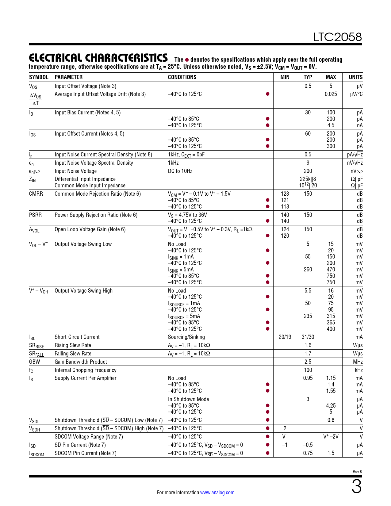 LTC2058 ELECTRICAL CHARACTERISTICSThe l denotes the specifications which apply over the full operatingtemperature range, otherwise specifications are at TA = 25°C. Unless otherwise noted, VS = ±2.5V; VCM = VOUT = 0V.SYMBOL PARAMETERCONDITIONSMINTYPMAXUNITS VOS Input Offset Voltage (Note 3) 0.5 5 μV ΔV Average Input Offset Voltage Drift (Note 3) –40°C to 125°C OS l 0.025 μV/°C ΔT IB Input Bias Current (Notes 4, 5) 30 100 pA –40°C to 85°C l 200 pA –40°C to 125°C l 4.5 nA IOS Input Offset Current (Notes 4, 5) 60 200 pA –40°C to 85°C l 200 pA –40°C to 125°C l 300 pA in Input Noise Current Spectral Density (Note 8) 1kHz, CEXT = 0pF 0.5 pA/√Hz en Input Noise Voltage Spectral Density 1kHz 9 nV/√Hz enP-P Input Noise Voltage DC to 10Hz 200 nVP-P ZIN Differential Input Impedance 225k||8 Ω||pF Common Mode Input Impedance 1012||20 Ω||pF CMRR Common Mode Rejection Ratio (Note 6) VCM = V– – 0.1V to V+ – 1.5V 123 150 dB –40°C to 85°C l 121 dB –40°C to 125°C l 118 dB PSRR Power Supply Rejection Ratio (Note 6) VS = 4.75V to 36V 140 150 dB –40°C to 125°C l 140 dB AVOL Open Loop Voltage Gain (Note 6) VOUT = V– +0.5V to V+ – 0.3V, RL =1kΩ 124 150 dB –40°C to 125°C l 120 dB VOL – V– Output Voltage Swing Low No Load 5 15 mV –40°C to 125°C l 20 mV ISINK = 1mA 55 150 mV –40°C to 125°C l 200 mV ISINK = 5mA 260 470 mV –40°C to 85°C l 750 mV –40°C to 125°C l 750 mV V+ – VOH Output Voltage Swing High No Load 5.5 16 mV –40°C to 125°C l 20 mV ISOURCE = 1mA 50 75 mV –40°C to 125°C l 95 mV ISOURCE = 5mA 235 315 mV –40°C to 85°C l 365 mV –40°C to 125°C l 400 mV ISC Short-Circuit Current Sourcing/Sinking 20/19 31/30 mA SRRISE Rising Slew Rate AV = –1, RL = 10kΩ 1.6 V/μs SRFALL Falling Slew Rate AV = –1, RL = 10kΩ 1.7 V/μs GBW Gain Bandwidth Product 2.5 MHz fC Internal Chopping Frequency 100 kHz IS Supply Current Per Amplifier No Load 0.95 1.15 mA –40°C to 85°C l 1.4 mA –40°C to 125°C l 1.55 mA In Shutdown Mode 3 µA –40°C to 85°C l 4.25 µA –40°C to 125°C l 5 µA VSDL Shutdown Threshold (SD – SDCOM) Low (Note 7) –40°C to 125°C l 0.8 V VSDH Shutdown Threshold (SD – SDCOM) High (Note 7) –40°C to 125°C l 2 V SDCOM Voltage Range (Note 7) –40°C to 125°C l V– V+ –2V V ISD SD Pin Current (Note 7) –40°C to 125°C, VSD – VSDCOM = 0 l –1 –0.5 µA ISDCOM SDCOM Pin Current (Note 7) –40°C to 125°C, VSD – VSDCOM = 0 l 0.75 1.5 µA Rev 0 For more information www.analog.com 3 Document Outline Features Applications Typical Application Description Absolute Maximum Ratings Pin Configuration Order Information Electrical Characteristics Typical Performance Characteristics Pin Functions Block Diagrams Applications Information Typical Applications Package Description Typical Application Related Parts