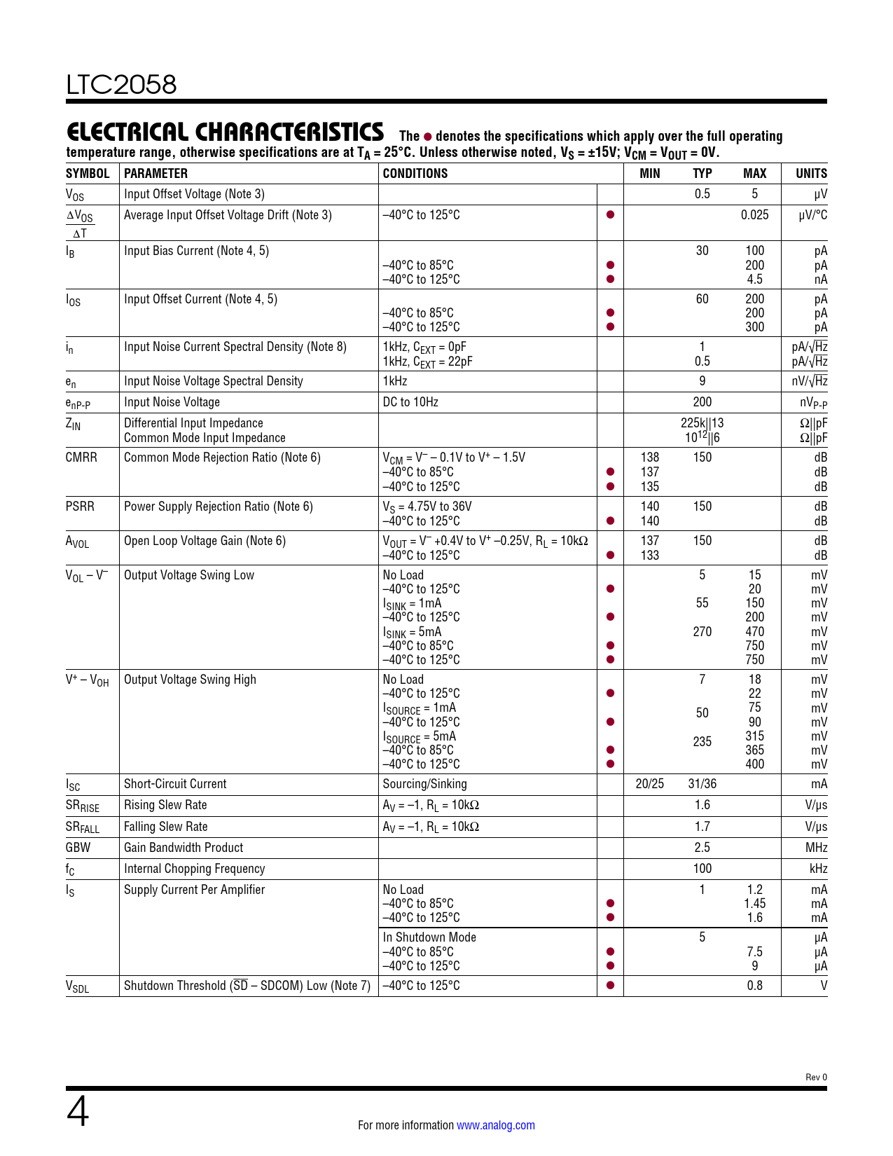 VOS Input Offset Voltage (Note 3) 0.5 5 μV ΔVOS Average Input Offset Voltage Drift (Note 3) –40°C to 125°C l 0.025 μV/°C ΔT IB Input Bias Current (Note 4, 5) 30 100 pA –40°C to 85°C l 200 pA –40°C to 125°C l 4.5 nA IOS Input Offset Current (Note 4, 5) 60 200 pA –40°C to 85°C l 200 pA –40°C to 125°C l 300 pA in Input Noise Current Spectral Density (Note 8) 1kHz, CEXT = 0pF 1 pA/√Hz 1kHz, CEXT = 22pF 0.5 pA/√Hz en Input Noise Voltage Spectral Density 1kHz 9 nV/√Hz enP-P Input Noise Voltage DC to 10Hz 200 nVP-P ZIN Differential Input Impedance 225k||13 Ω||pF Common Mode Input Impedance 1012||6 Ω||pF CMRR Common Mode Rejection Ratio (Note 6) VCM = V– – 0.1V to V+ – 1.5V 138 150 dB –40°C to 85°C l 137 dB –40°C to 125°C l 135 dB PSRR Power Supply Rejection Ratio (Note 6) VS = 4.75V to 36V 140 150 dB –40°C to 125°C l 140 dB AVOL Open Loop Voltage Gain (Note 6) VOUT = V– +0.4V to V+ –0.25V, RL = 10kΩ 137 150 dB –40°C to 125°C l 133 dB VOL – V– Output Voltage Swing Low No Load 5 15 mV –40°C to 125°C l 20 mV ISINK = 1mA 55 150 mV –40°C to 125°C l 200 mV ISINK = 5mA 270 470 mV –40°C to 85°C l 750 mV –40°C to 125°C l 750 mV V+ – VOH Output Voltage Swing High No Load 7 18 mV –40°C to 125°C l 22 mV ISOURCE = 1mA 50 75 mV –40°C to 125°C l 90 mV ISOURCE = 5mA 235 315 mV –40°C to 85°C l 365 mV –40°C to 125°C l 400 mV ISC Short-Circuit Current Sourcing/Sinking 20/25 31/36 mA SRRISE Rising Slew Rate AV = –1, RL = 10kΩ 1.6 V/μs SRFALL Falling Slew Rate AV = –1, RL = 10kΩ 1.7 V/μs GBW Gain Bandwidth Product 2.5 MHz fC Internal Chopping Frequency 100 kHz IS Supply Current Per Amplifier No Load 1 1.2 mA –40°C to 85°C l 1.45 mA –40°C to 125°C l 1.6 mA In Shutdown Mode 5 µA –40°C to 85°C l 7.5 µA –40°C to 125°C l 9 µA VSDL Shutdown Threshold (SD – SDCOM) Low (Note 7) –40°C to 125°C l 0.8 V Rev 0 4 For more information www.analog.com Document Outline Features Applications Typical Application Description Absolute Maximum Ratings Pin Configuration Order Information Electrical Characteristics Typical Performance Characteristics Pin Functions Block Diagrams Applications Information Typical Applications Package Description Typical Application Related Parts