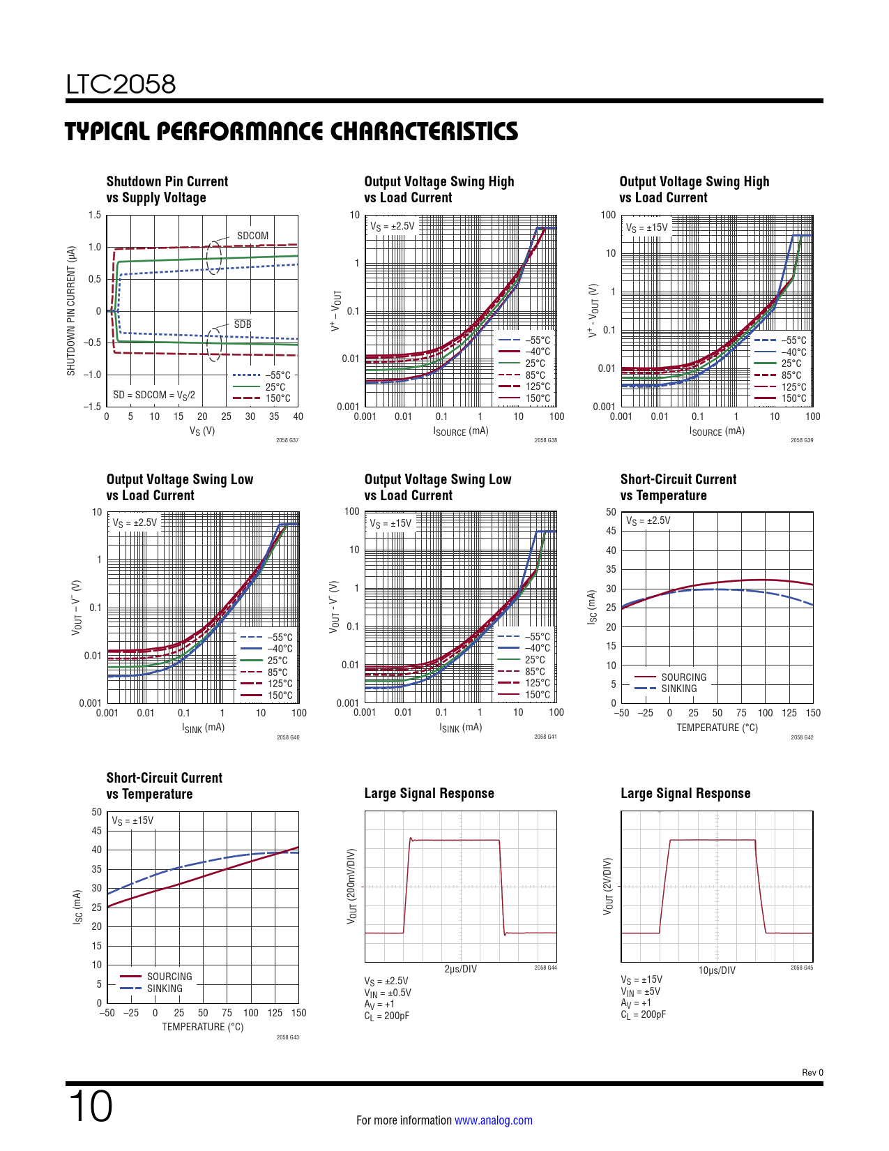 10 100 50 VS = ±2.5V V V S = ±15V S = ±2.5V 45 10 40 1 35 1 30 – (V) - (V) 0.1 – V - V (mA) 25 I SC V OUT 0.1 V OUT 20 –55°C –55°C –40°C –40°C 15 0.01 25°C 25°C 0.01 10 85°C 85°C SOURCING 125°C 125°C 5 SINKING 150°C 150°C 0.001 0.001 0 0.001 0.01 0.1 1 10 100 0.001 0.01 0.1 1 10 100 –50 –25 0 25 50 75 100 125 150 ISINK (mA) ISINK (mA) TEMPERATURE (°C) 2058 G40 2058 G41 2058 G42