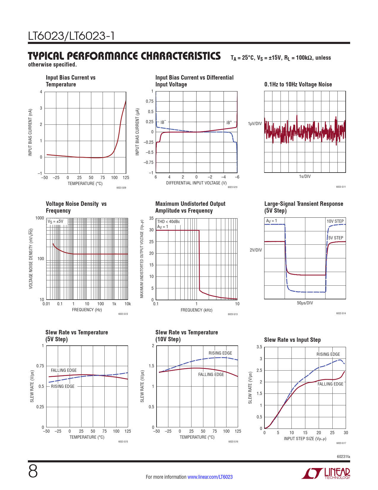 4 1 0.75 3 0.5 0.25 2 IB– IB+ 1µV/DIV 0 1 –0.25 INPUT BIAS CURRENT (nA) –0.5 INPUT BIAS CURRENT (µA) 0 –0.75 –1 –1 –50 –25 0 25 50 75 100 125 6 4 2 0 –2 –4 –6 1s/DIV TEMPERATURE (°C) DIFFERENTIAL INPUT VOLTAGE (V) 6023 G09 6023 G10 6023 G11