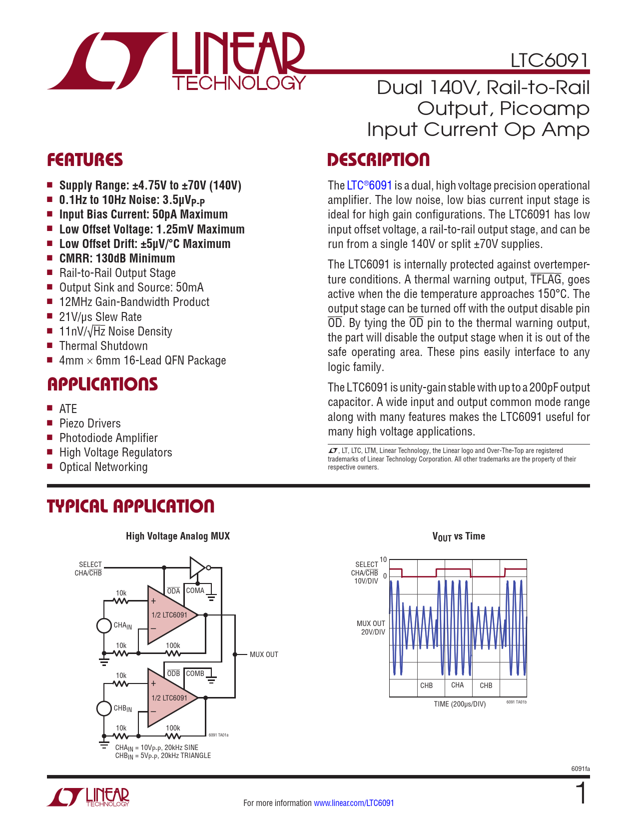 LTC6091 Dual 140V, Rail-to-Rail Output, Picoamp Input Current Op Amp FEATURESDESCRIPTION n Supply Range: ±4.75V to ±70V (140V) The LTC®6091 is a dual, high voltage precision operational n 0.1Hz to 10Hz Noise: 3.5μVP-P amplifier. The low noise, low bias current input stage is n Input Bias Current: 50pA Maximum ideal for high gain configurations. The LTC6091 has low n Low Offset Voltage: 1.25mV Maximum input offset voltage, a rail-to-rail output stage, and can be n Low Offset Drift: ±5μV/°C Maximum run from a single 140V or split ±70V supplies. n CMRR: 130dB Minimum The LTC6091 is internally protected against overtemper- n Rail-to-Rail Output Stage ture conditions. A thermal warning output, TFLAG, goes n Output Sink and Source: 50mA active when the die temperature approaches 150°C. The n 12MHz Gain-Bandwidth Product output stage can be turned off with the output disable pin n 21V/μs Slew Rate OD. By tying the OD pin to the thermal warning output, n 11nV/√Hz Noise Density the part will disable the output stage when it is out of the n Thermal Shutdown safe operating area. These pins easily interface to any n 4mm × 6mm 16-Lead QFN Package logic family. APPLICATIONS The LTC6091 is unity-gain stable with up to a 200pF output capacitor. A wide input and output common mode range n ATE along with many features makes the LTC6091 useful for n Piezo Drivers many high voltage applications. n Photodiode Amplifier n High Voltage Regulators L, LT, LTC, LTM, Linear Technology, the Linear logo and Over-The-Top are registered trademarks of Linear Technology Corporation. All other trademarks are the property of their n Optical Networking respective owners. TYPICAL APPLICATIONHigh Voltage Analog MUXVOUT vs Time 10 SELECT SELECT CHA/CHB CHA/CHB 0 10V/DIV 10k ODA COMA + 1/2 LTC6091 CHAIN – MUX OUT 20V/DIV 10k 100k MUX OUT 10k ODB COMB + CHB CHA CHB 1/2 LTC6091 CHB TIME (200µs/DIV) 6091 TA01b IN – 10k 100k 6091 TA01a CHAIN = 10VP-P, 20kHz SINE CHBIN = 5VP-P, 20kHz TRIANGLE 6091fa For more information www.linear.com/LTC6091 1 Document Outline Features Applications Description Typical Application Absolute Maximum Ratings Pin Configuration Order Information Electrical Characteristics Typical Performance Characteristics Pin Functions Block Diagram Applications Information Typical Applications Package Description Typical Application Related Parts
