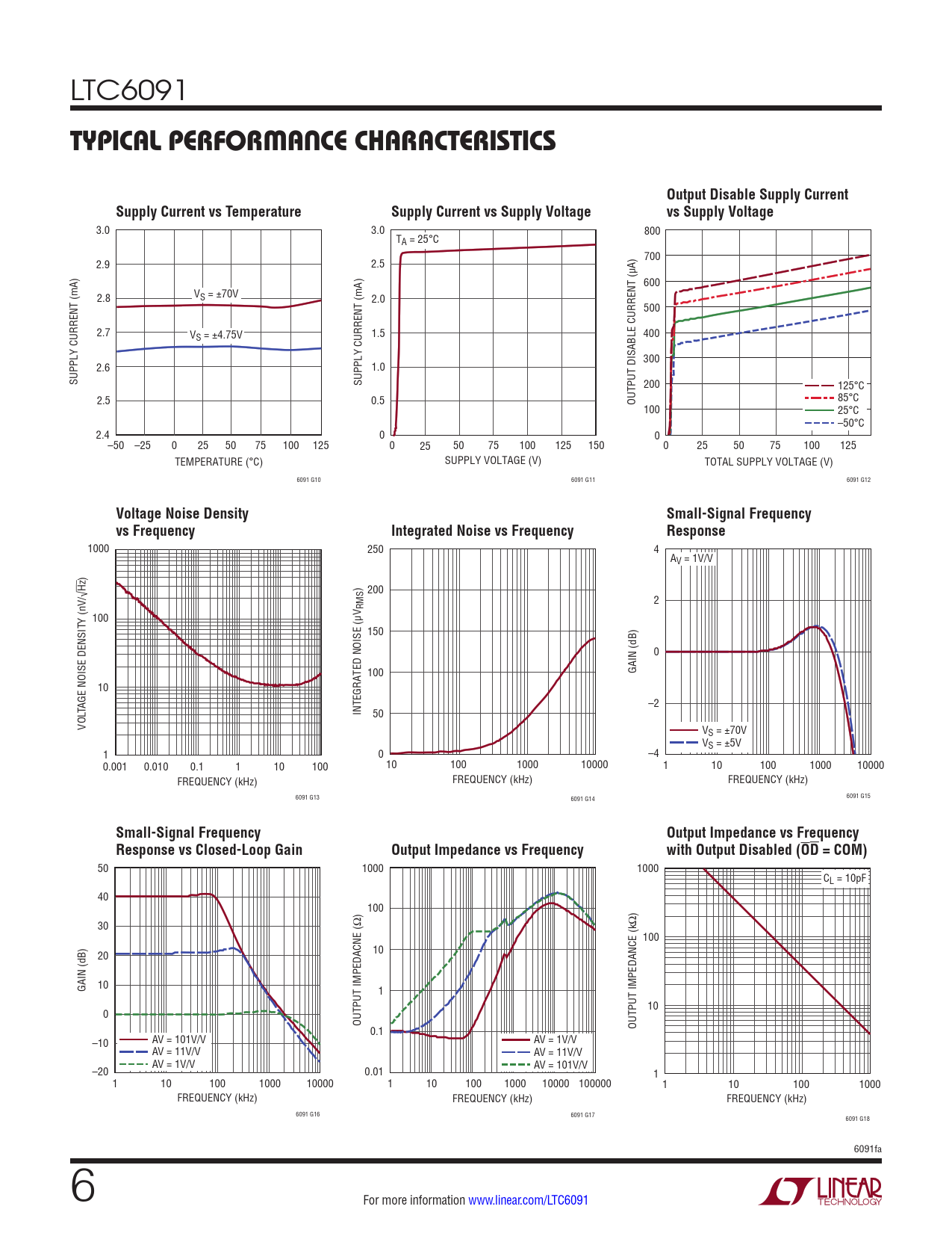 3.0 3.0 800 TA = 25°C 700 2.9 2.5 600 2.8 VS = ±70V 2.0 500 2.7 VS = ±4.75V 1.5 400 300 2.6 1.0 SUPPLY CURRENT (mA) SUPPLY CURRENT (mA) 200 125°C 2.5 0.5 OUTPUT DISABLE CURRENT (µA) 85°C 100 25°C –50°C 2.4 0 0 –50 –25 0 25 50 75 100 125 0 25 50 75 100 125 150 0 25 50 75 100 125 TEMPERATURE (°C) SUPPLY VOLTAGE (V) TOTAL SUPPLY VOLTAGE (V) 6091 G10 6091 G11 6091 G12