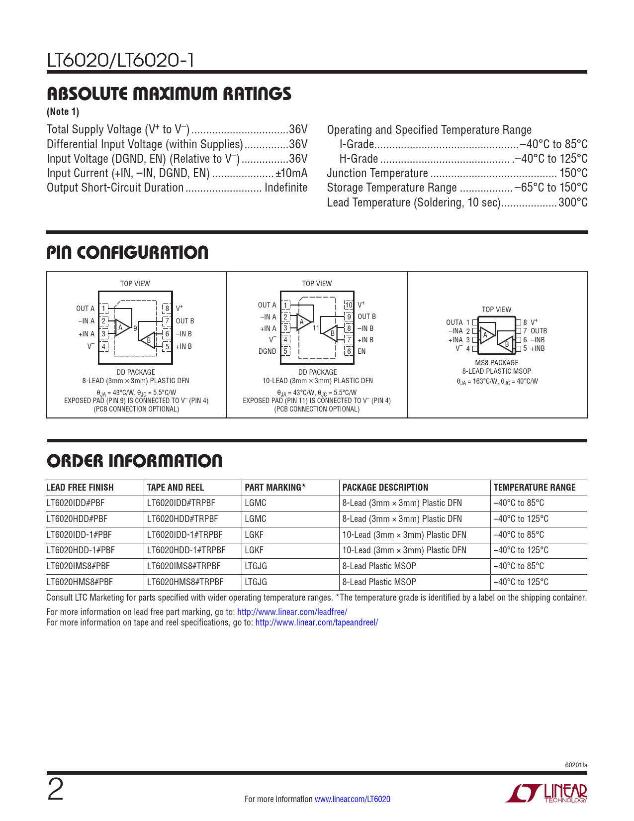 absoluTe MaxiMuM raTings (Note 1). pin conFiguraTion. orDer inForMaTion LEAD FREE FINISH. TAPE AND REEL. PART MARKING*