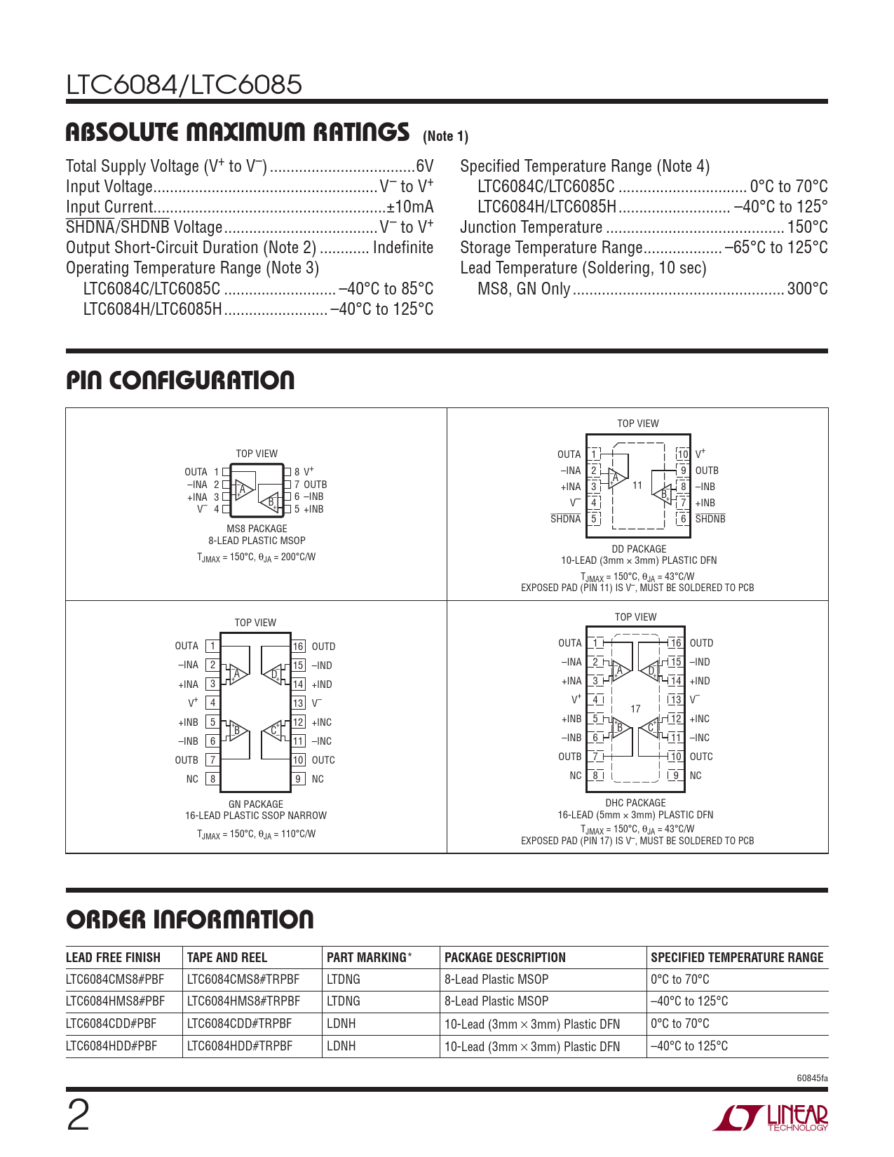 Total Supply Voltage (V+ to V–) ...6V Specifi ed Temperature Range (Note 4) Input Voltage .. V– to V+ LTC6084C/LTC6085C ... 0°C to 70°C Input Current ..±10mA LTC6084H/LTC6085H ... –40°C to 125° SHDNA/SHDNB Voltage ...V– to V+ Junction Temperature ... 150°C Output Short-Circuit Duration (Note 2) .. Indefi nite Storage Temperature Range ... –65°C to 125°C Operating Temperature Range (Note 3) Lead Temperature (Soldering, 10 sec) LTC6084C/LTC6085C ... –40°C to 85°C MS8, GN Only ... 300°C LTC6084H/LTC6085H ... –40°C to 125°C