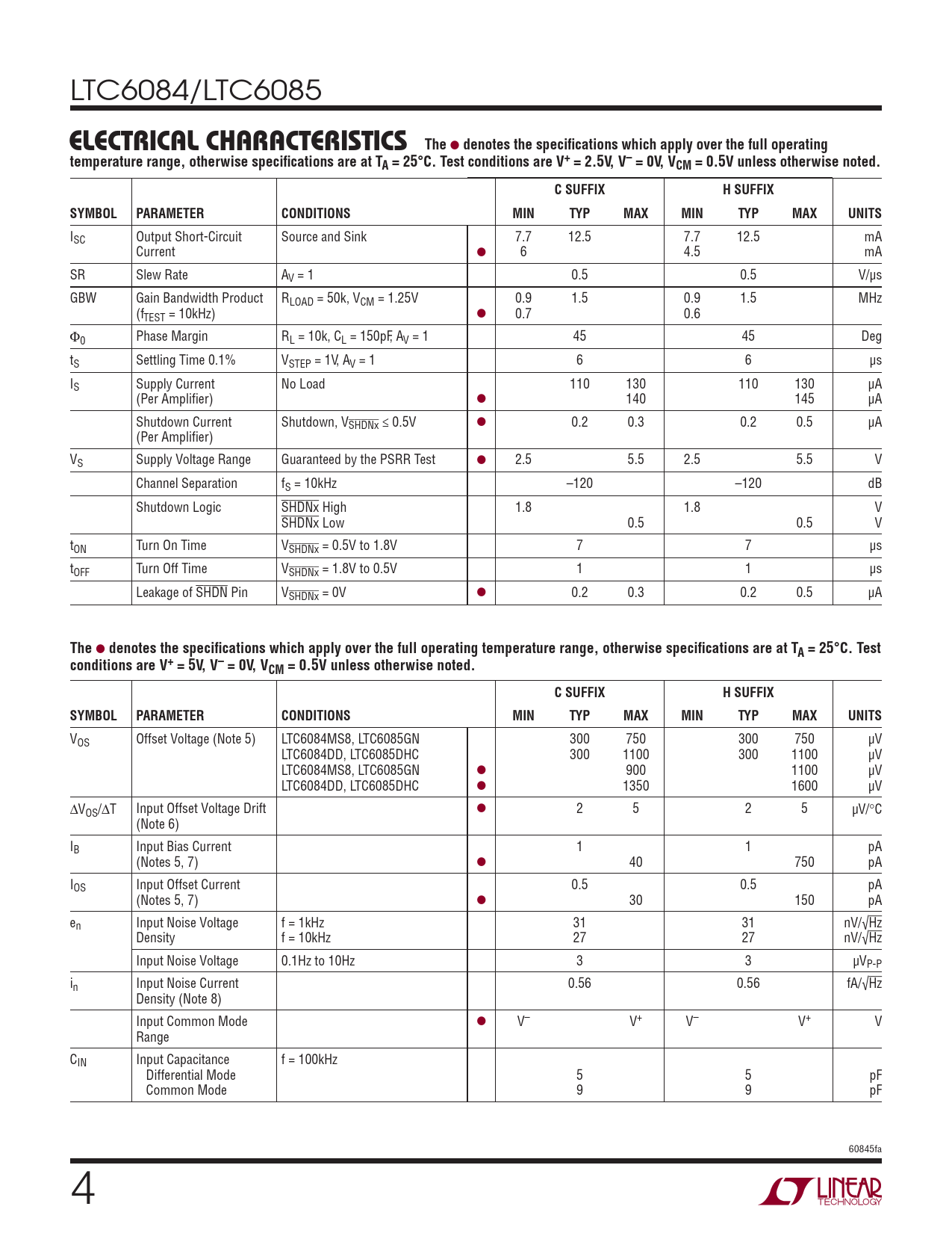 VOS Offset Voltage (Note 5) LTC6084MS8, LTC6085GN 300 750 300 750 μV LTC6084DD, LTC6085DHC 300 1100 300 1100 μV LTC6084MS8, LTC6085GN l 900 1100 μV LTC6084DD, LTC6085DHC l 1350 1600 μV ΔV l OS/ΔT Input Offset Voltage Drift 2 5 2 5 μV/°C (Note 6) IB Input Bias Current 1 1 pA (Notes 5, 7) l 40 750 pA IOS Input Offset Current 0.5 0.5 pA (Notes 5, 7) l 30 150 pA en Input Noise Voltage f = 1kHz 31 31 nV/√Hz Density f = 10kHz 27 27 nV/√Hz Input Noise Voltage 0.1Hz to 10Hz 3 3 μVP-P in Input Noise Current 0.56 0.56 fA/√Hz Density (Note 8) Input Common Mode l V– V+ V– V+ V Range CIN Input Capacitance f = 100kHz Differential Mode 5 5 pF Common Mode 9 9 pF 60845fa 4