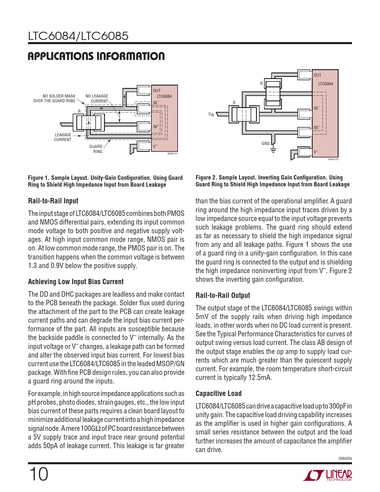 than the bias current of the operational amplifi er. A guard ring around the high impedance input traces driven by a The input stage of LTC6084/LTC6085 combines both PMOS low impedance source equal to the input voltage prevents and NMOS differential pairs, extending its input common such leakage problems. The guard ring should extend mode voltage to both positive and negative supply volt- as far as necessary to shield the high impedance signal ages. At high input common mode range, NMOS pair is from any and all leakage paths. Figure 1 shows the use on. At low common mode range, the PMOS pair is on. The of a guard ring in a unity-gain confi guration. In this case transition happens when the common voltage is between the guard ring is connected to the output and is shielding 1.3 and 0.9V below the positive supply. the high impedance noninverting input from V–. Figure 2