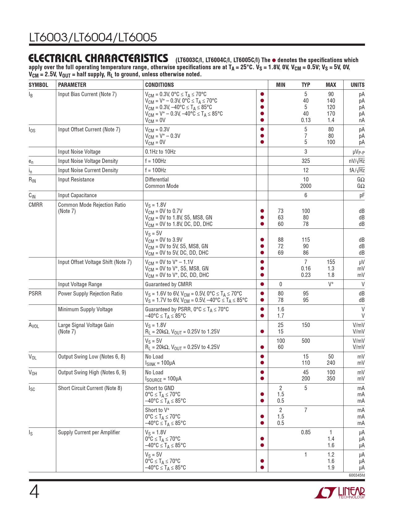 LT6003/LT6004/LT6005 ELECTRICAL CHARACTERISTICS(LT6003C/I, LT6004C/I, LT6005C/I) The l denotes the specifications whichapply over the full operating temperature range, otherwise specifications are at TA = 25°C. VS = 1.8V, 0V, VCM = 0.5V; VS = 5V, 0V,VCM = 2.5V, VOUT = half supply, RL to ground, unless otherwise noted. SYMBOLPARAMETERCONDITIONSMINTYPMAXUNITS IB Input Bias Current (Note 7) VCM = 0.3V, 0°C ≤ TA ≤ 70°C l 5 90 pA VCM = V+ – 0.3V, 0°C ≤ TA ≤ 70°C l 40 140 pA VCM = 0.3V, –40°C ≤ TA ≤ 85°C l 5 120 pA VCM = V+ – 0.3V, –40°C ≤ TA ≤ 85°C l 40 170 pA VCM = 0V l 0.13 1.4 nA IOS Input Offset Current (Note 7) VCM = 0.3V l 5 80 pA VCM = V+ – 0.3V l 7 80 pA VCM = 0V l 5 100 pA Input Noise Voltage 0.1Hz to 10Hz 3 µVP-P en Input Noise Voltage Density f = 100Hz 325 nV/√Hz in Input Noise Current Density f = 100Hz 12 fA/√Hz RIN Input Resistance Differential 10 GΩ Common Mode 2000 GΩ CIN Input Capacitance 6 pF CMRR Common Mode Rejection Ratio VS = 1.8V (Note 7) VCM = 0V to 0.7V l 73 100 dB VCM = 0V to 1.8V, S5, MS8, GN l 63 80 dB VCM = 0V to 1.8V, DC, DD, DHC l 60 78 dB VS = 5V VCM = 0V to 3.9V l 88 115 dB VCM = 0V to 5V, S5, MS8, GN l 72 90 dB VCM = 0V to 5V, DC, DD, DHC l 69 86 dB Input Offset Voltage Shift (Note 7) VCM = 0V to V+ – 1.1V l 7 155 µV VCM = 0V to V+, S5, MS8, GN l 0.16 1.3 mV VCM = 0V to V+, DC, DD, DHC l 0.23 1.8 mV Input Voltage Range Guaranteed by CMRR l 0 V+ V PSRR Power Supply Rejection Ratio VS = 1.6V to 6V, VCM = 0.5V, 0°C ≤ TA ≤ 70°C l 80 95 dB VS = 1.7V to 6V, VCM = 0.5V, –40°C ≤ TA ≤ 85°C l 78 95 dB Minimum Supply Voltage Guaranteed by PSRR, 0°C ≤ TA ≤ 70°C l 1.6 V –40°C ≤ TA ≤ 85°C l 1.7 V AVOL Large Signal Voltage Gain VS = 1.8V 25 150 V/mV (Note 7) RL = 20kΩ, VOUT = 0.25V to 1.25V l 15 V/mV VS = 5V 100 500 V/mV RL = 20kΩ, VOUT = 0.25V to 4.25V l 60 V/mV VOL Output Swing Low (Notes 6, 8) No Load l 15 50 mV ISINK = 100µA l 110 240 mV VOH Output Swing High (Notes 6, 9) No Load l 45 100 mV ISOURCE = 100µA l 200 350 mV ISC Short Circuit Current (Note 8) Short to GND 2 5 mA 0°C ≤ TA ≤ 70°C l 1.5 mA –40°C ≤ TA ≤ 85°C l 0.5 mA Short to V+ 2 7 mA 0°C ≤ TA ≤ 70°C l 1.5 mA –40°C ≤ TA ≤ 85°C l 0.5 mA IS Supply Current per Amplifier VS = 1.8V 0.85 1 µA 0°C ≤ TA ≤ 70°C l 1.4 µA –40°C ≤ TA ≤ 85°C l 1.6 µA VS = 5V 1 1.2 µA 0°C ≤ TA ≤ 70°C l 1.6 µA –40°C ≤ TA ≤ 85°C l 1.9 µA 600345fd 4