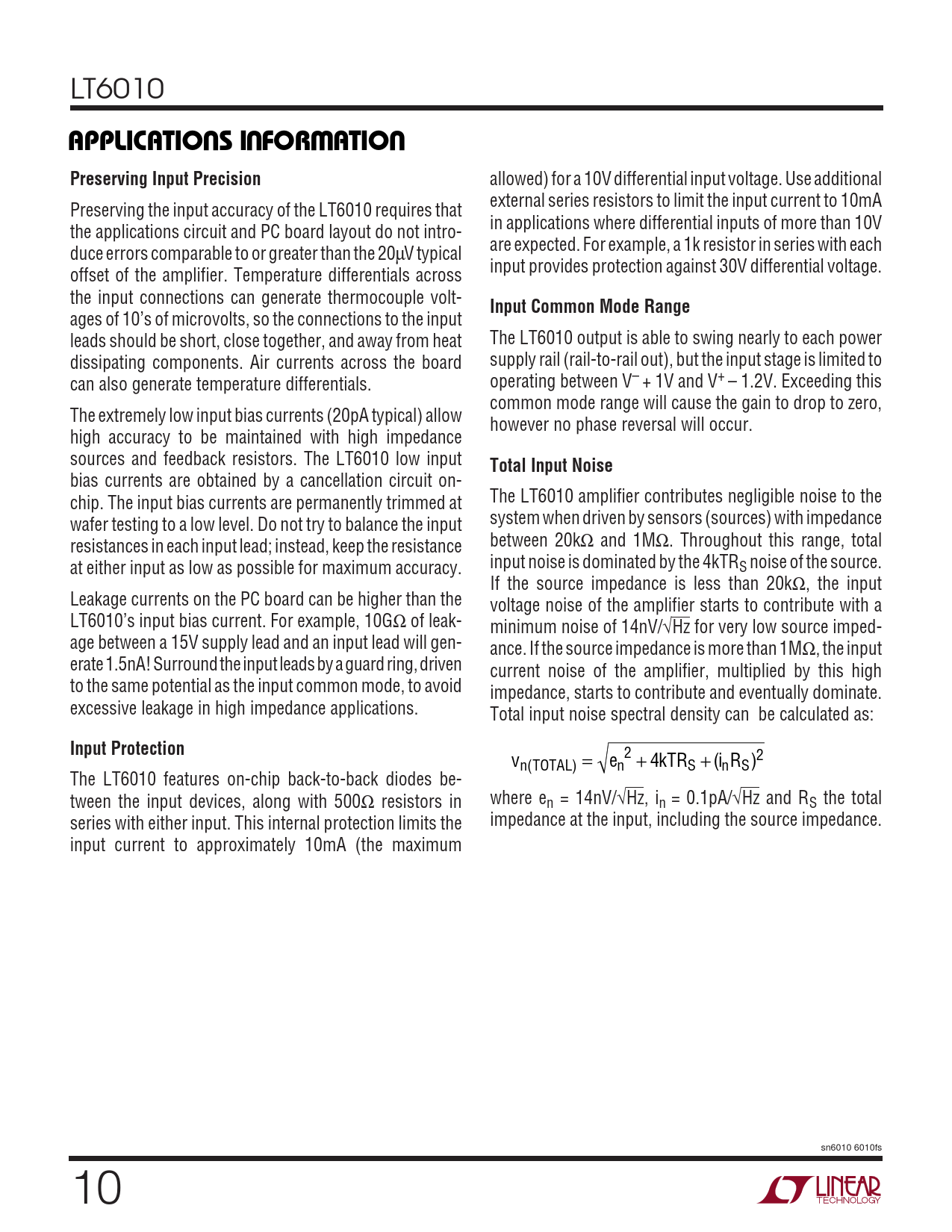 v = e 2 + kTR 4 + i( R 2 n(TOTAL) n S n S) The LT6010 features on-chip back-to-back diodes be- tween the input devices, along with 500Ω resistors in where en = 14nV/√Hz, in = 0.1pA/√Hz and RS the total series with either input. This internal protection limits the impedance at the input, including the source impedance. input current to approximately 10mA (the maximum sn6010 6010fs 10