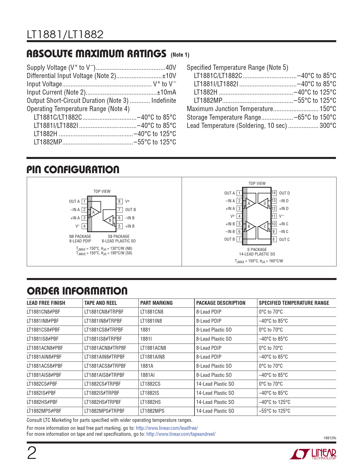 LT1881CN8#PBF LT1881CN8#TRPBF LT1881CN8 8-Lead PDIP 0°C to 70°C LT1881IN8#PBF LT1881IN8#TRPBF LT1881IN8 8-Lead PDIP –40°C to 85°C LT1881CS8#PBF LT1881CS8#TRPBF 1881 8-Lead Plastic SO 0°C to 70°C LT1881IS8#PBF LT1881IS8#TRPBF 1881I 8-Lead Plastic SO –40°C to 85°C LT1881ACN8#PBF LT1881ACN8#TRPBF LT1881ACN8 8-Lead PDIP 0°C to 70°C LT1881AIN8#PBF LT1881AIN8#TRPBF LT1881AIN8 8-Lead PDIP –40°C to 85°C LT1881ACS8#PBF LT1881ACS8#TRPBF 1881A 8-Lead Plastic SO 0°C to 70°C LT1881AIS8#PBF LT1881AIS8#TRPBF 1881AI 8-Lead Plastic SO –40°C to 85°C LT1882CS#PBF LT1882CS#TRPBF LT1882CS 14-Lead Plastic SO 0°C to 70°C LT1882IS#PBF LT1882IS#TRPBF LT1882IS 14-Lead Plastic SO –40°C to 85°C LT1882HS#PBF LT1882HS#TRPBF LT1882HS 14-Lead Plastic SO –40°C to 125°C LT1882MPS#PBF LT1882MPS#TRPBF LT1882MPS 14-Lead Plastic SO –55°C to 125°C Consult LTC Marketing for parts specifi ed with wider operating temperature ranges. For more information on lead free part marking, go to: http://www.linear.com/leadfree/ For more information on tape and reel specifi cations, go to: http://www.linear.com/tapeandreel/ 18812fb 2