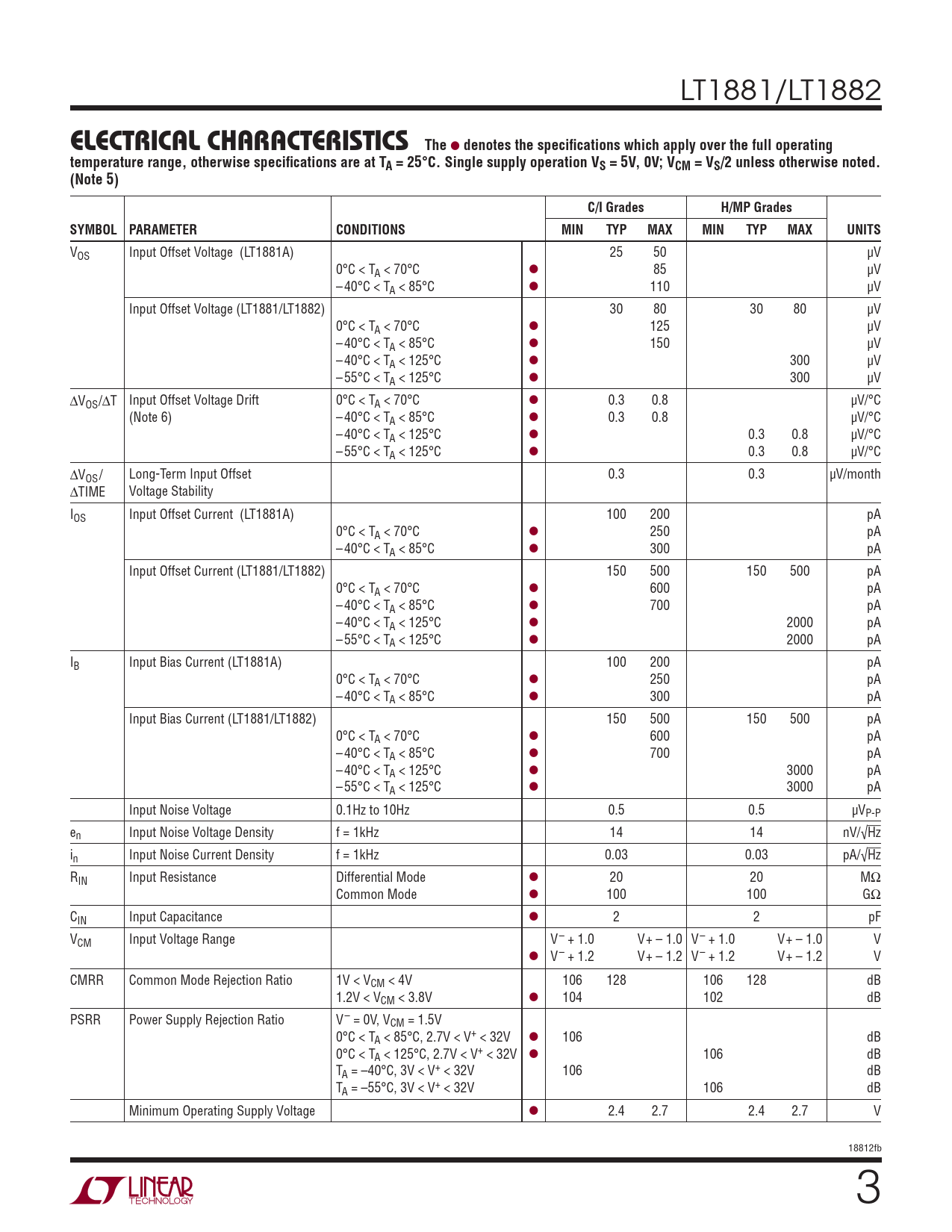 VOS Input Offset Voltage (LT1881A) 25 50 μV 0°C < TA < 70°C l 85 μV – 40°C < TA < 85°C l 110 μV Input Offset Voltage (LT1881/LT1882) 30 80 30 80 μV 0°C < TA < 70°C l 125 μV – 40°C < TA < 85°C l 150 μV – 40°C < TA < 125°C l 300 μV – 55°C < TA < 125°C l 300 μV ΔV l OS/ΔT Input Offset Voltage Drift 0°C < TA < 70°C 0.3 0.8 μV/°C (Note 6) – 40°C < TA < 85°C l 0.3 0.8 μV/°C – 40°C < TA < 125°C l 0.3 0.8 μV/°C – 55°C < TA < 125°C l 0.3 0.8 μV/°C ΔVOS/ Long-Term Input Offset 0.3 0.3 μV/month ΔTIME Voltage Stability IOS Input Offset Current (LT1881A) 100 200 pA 0°C < TA < 70°C l 250 pA – 40°C < TA < 85°C l 300 pA Input Offset Current (LT1881/LT1882) 150 500 150 500 pA 0°C < TA < 70°C l 600 pA – 40°C < TA < 85°C l 700 pA – 40°C < TA < 125°C l 2000 pA – 55°C < TA < 125°C l 2000 pA IB Input Bias Current (LT1881A) 100 200 pA 0°C < TA < 70°C l 250 pA – 40°C < TA < 85°C l 300 pA Input Bias Current (LT1881/LT1882) 150 500 150 500 pA 0°C < TA < 70°C l 600 pA – 40°C < TA < 85°C l 700 pA – 40°C < TA < 125°C l 3000 pA – 55°C < TA < 125°C l 3000 pA Input Noise Voltage 0.1Hz to 10Hz 0.5 0.5 μVP-P en Input Noise Voltage Density f = 1kHz 14 14 nV/√Hz in Input Noise Current Density f = 1kHz 0.03 0.03 pA/√Hz RIN Input Resistance Differential Mode l 20 20 MΩ Common Mode l 100 100 GΩ CIN Input Capacitance l 2 2 pF VCM Input Voltage Range V– + 1.0 V+ – 1.0 V– + 1.0 V+ – 1.0 V l V– + 1.2 V+ – 1.2 V– + 1.2 V+ – 1.2 V CMRR Common Mode Rejection Ratio 1V < VCM < 4V 106 128 106 128 dB 1.2V < VCM < 3.8V l 104 102 dB PSRR Power Supply Rejection Ratio V– = 0V, VCM = 1.5V 0°C < TA < 85°C, 2.7V < V+ < 32V l 106 dB 0°C < TA < 125°C, 2.7V < V+ < 32V l 106 dB TA = –40°C, 3V < V+ < 32V 106 dB TA = –55°C, 3V < V+ < 32V 106 dB Minimum Operating Supply Voltage l 2.4 2.7 2.4 2.7 V 18812fb 3