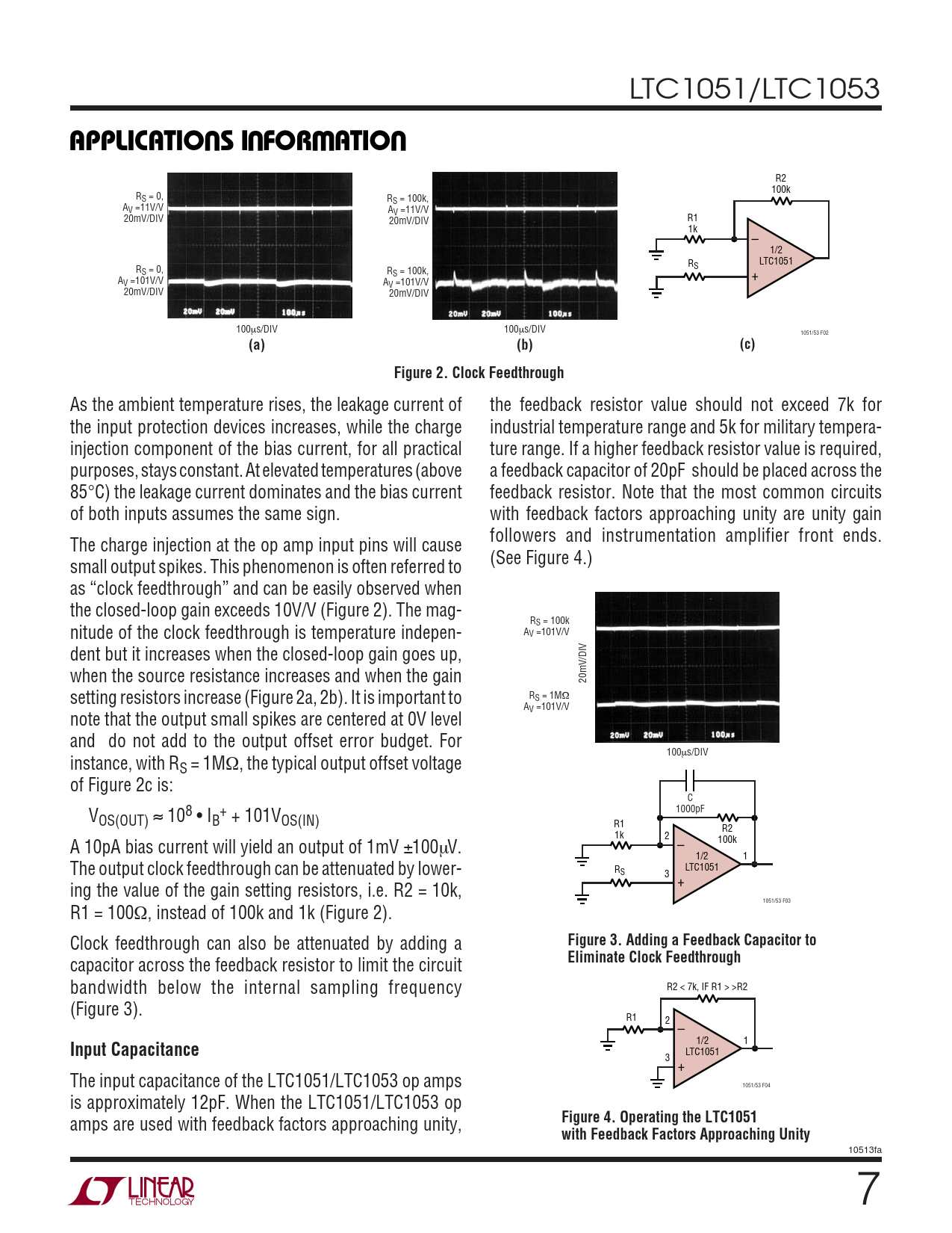 LTC1051 3 + The input capacitance of the LTC1051/LTC1053 op amps 1051/53 F04 is approximately 12pF. When the LTC1051/LTC1053 op amps are used with feedback factors approaching unity,