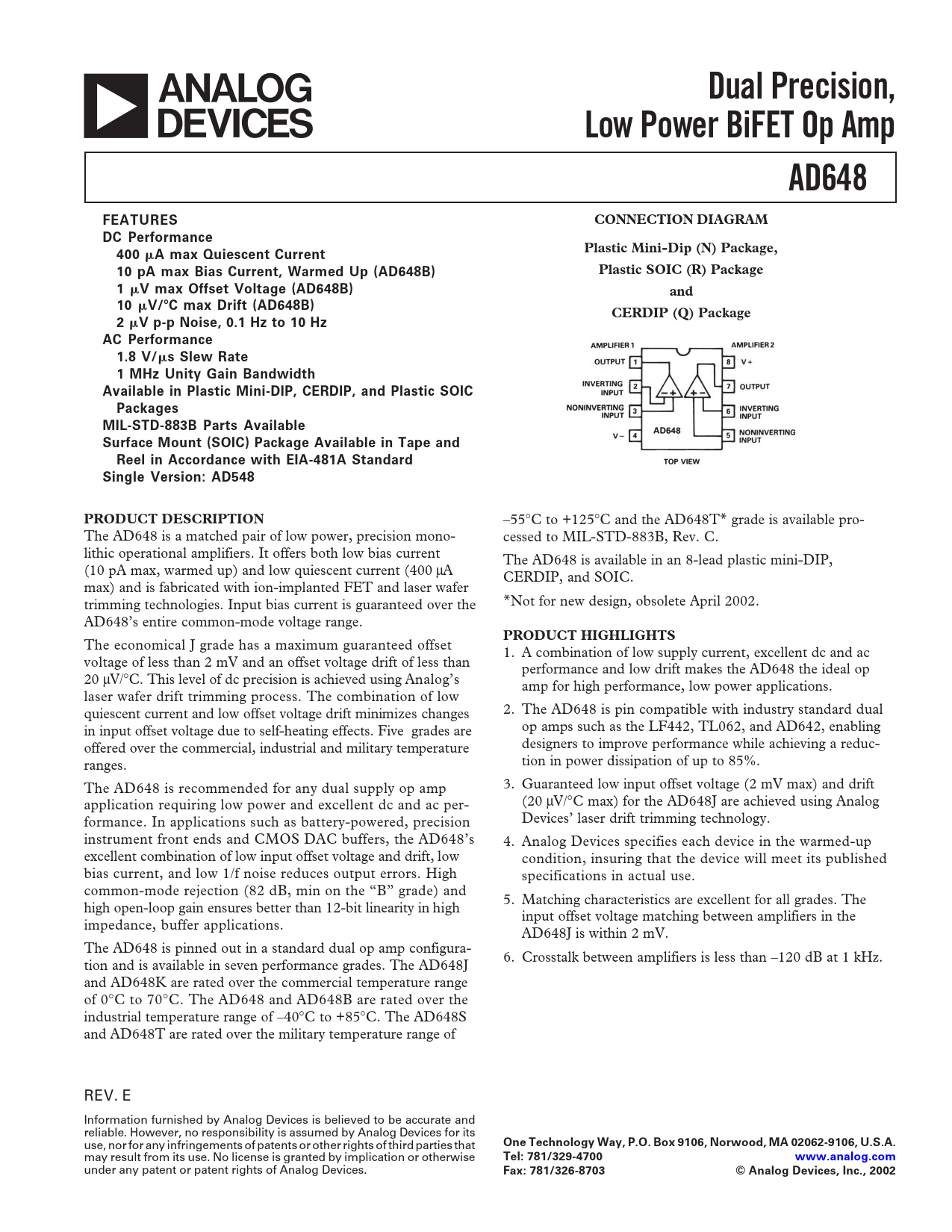 | Páginas / Página | 12 / 1 — Dual Precision,. Low Power BiFET Op Amp. AD648. FEATURES. CONNECTION … |