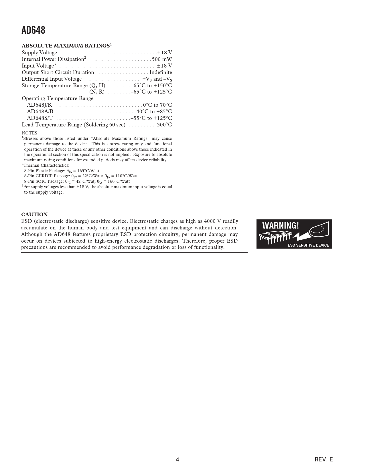 AD648. ABSOLUTE MAXIMUM RATINGS1. CAUTION. WARNING!. ESD SENSITIVE DEVICE
