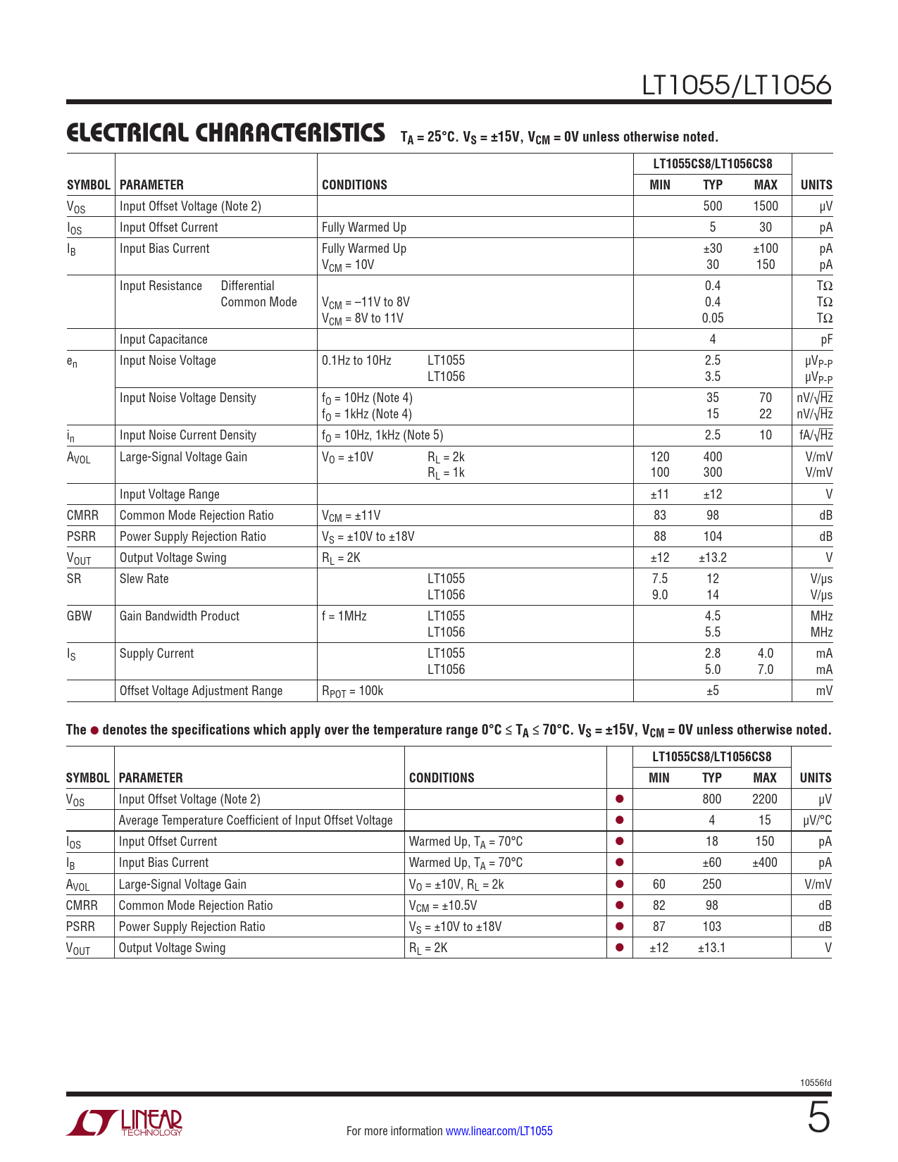 VOS Input Offset Voltage (Note 2) 500 1500 µV IOS Input Offset Current Fully Warmed Up 5 30 pA IB Input Bias Current Fully Warmed Up ±30 ±100 pA VCM = 10V 30 150 pA Input Resistance Differential 0.4 TΩ Common Mode VCM = –11V to 8V 0.4 TΩ VCM = 8V to 11V 0.05 TΩ Input Capacitance 4 pF en Input Noise Voltage 0.1Hz to 10Hz LT1055 2.5 µVP-P LT1056 3.5 µVP-P Input Noise Voltage Density fO = 10Hz (Note 4) 35 70 nV/√Hz fO = 1kHz (Note 4) 15 22 nV/√Hz in Input Noise Current Density fO = 10Hz, 1kHz (Note 5) 2.5 10 fA/√Hz AVOL Large-Signal Voltage Gain VO = ±10V RL = 2k 120 400 V/mV RL = 1k 100 300 V/mV Input Voltage Range ±11 ±12 V CMRR Common Mode Rejection Ratio VCM = ±11V 83 98 dB PSRR Power Supply Rejection Ratio VS = ±10V to ±18V 88 104 dB VOUT Output Voltage Swing RL = 2K ±12 ±13.2 V SR Slew Rate LT1055 7.5 12 V/µs LT1056 9.0 14 V/µs GBW Gain Bandwidth Product f = 1MHz LT1055 4.5 MHz LT1056 5.5 MHz IS Supply Current LT1055 2.8 4.0 mA LT1056 5.0 7.0 mA Offset Voltage Adjustment Range RPOT = 100k ±5 mV