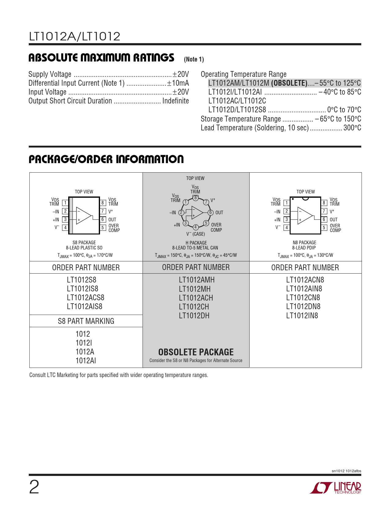 LT1012A/LT1012 WWWUABSOLUTE AXI U RATI GS (Note 1) Supply Voltage .. ± 20V Operating Temperature Range Differential Input Current (Note 1) .. ± 10mA LT1012AM/LT1012M (OBSOLETE) ..– 55°C to 125°C Input Voltage ... ± 20V LT1012I/LT1012AI ... – 40°C to 85°C Output Short Circuit Duration .. Indefinite LT1012AC/LT1012C LT1012D/LT1012S8 .. 0°C to 70°C Storage Temperature Range ... – 65°C to 150°C Lead Temperature (Soldering, 10 sec).. 300°C UWUPACKAGE/ORDER I FOR ATIO TOP VIEW VOS TOP VIEW TRIM TOP VIEW VOS V 8 OS VOS TRIM V+ VOS VOS 1 8 1 TRIM TRIM 7 1 8 TRIM TRIM – –IN 2 – 7 V+ –IN 2 6 OUT –IN 2 – 7 V+ + +IN 3 + 6 OUT +IN 3 + 6 OUT +IN 3 5 OVER V– 4 5 OVER 4 V – 4 5 OVER COMP COMP COMP V – (CASE) S8 PACKAGE H PACKAGE N8 PACKAGE 8-LEAD PLASTIC SO 8-LEAD TO-5 METAL CAN 8-LEAD PDIP TJMAX = 100°C, θJA = 170°C/W TJMAX = 150°C, θJA = 150°C/W, θJC = 45°C/W TJMAX = 100°C, θJA = 130°C/W ORDER PART NUMBER ORDER PART NUMBER ORDER PART NUMBER LT1012S8 LT1012AMH LT1012ACN8 LT1012IS8 LT1012MH LT1012AIN8 LT1012ACS8 LT1012ACH LT1012CN8 LT1012AIS8 LT1012CH LT1012DN8 LT1012DH LT1012IN8 S8 PART MARKING 1012 1012I 1012A OBSOLETE PACKAGE 1012AI Consider the S8 or N8 Packages for Alternate Source Consult LTC Marketing for parts specified with wider operating temperature ranges. sn1012 1012afbs 2