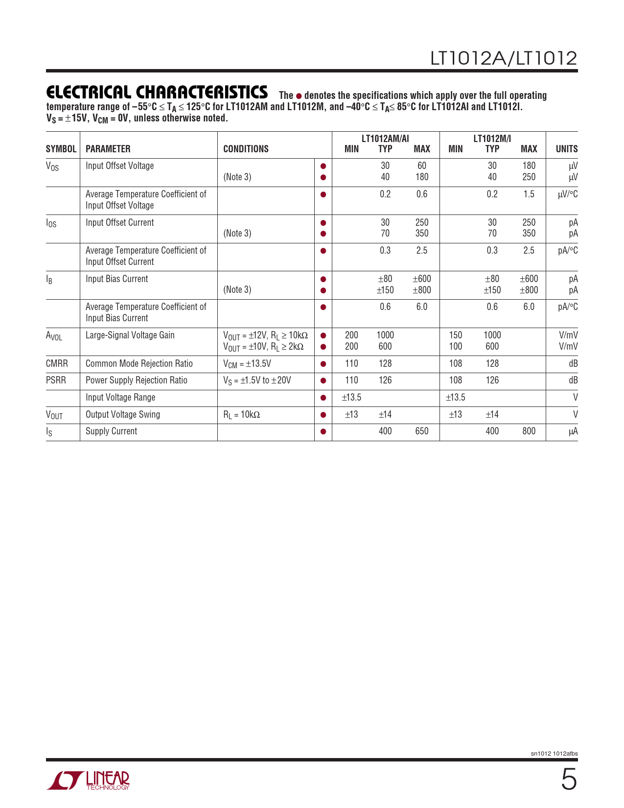 15V, VCM = 0V, unless otherwise noted. LT1012AM/AI LT1012M/I SYMBOL PARAMETER CONDITIONS MIN TYP MAX MIN TYP MAX UNITS