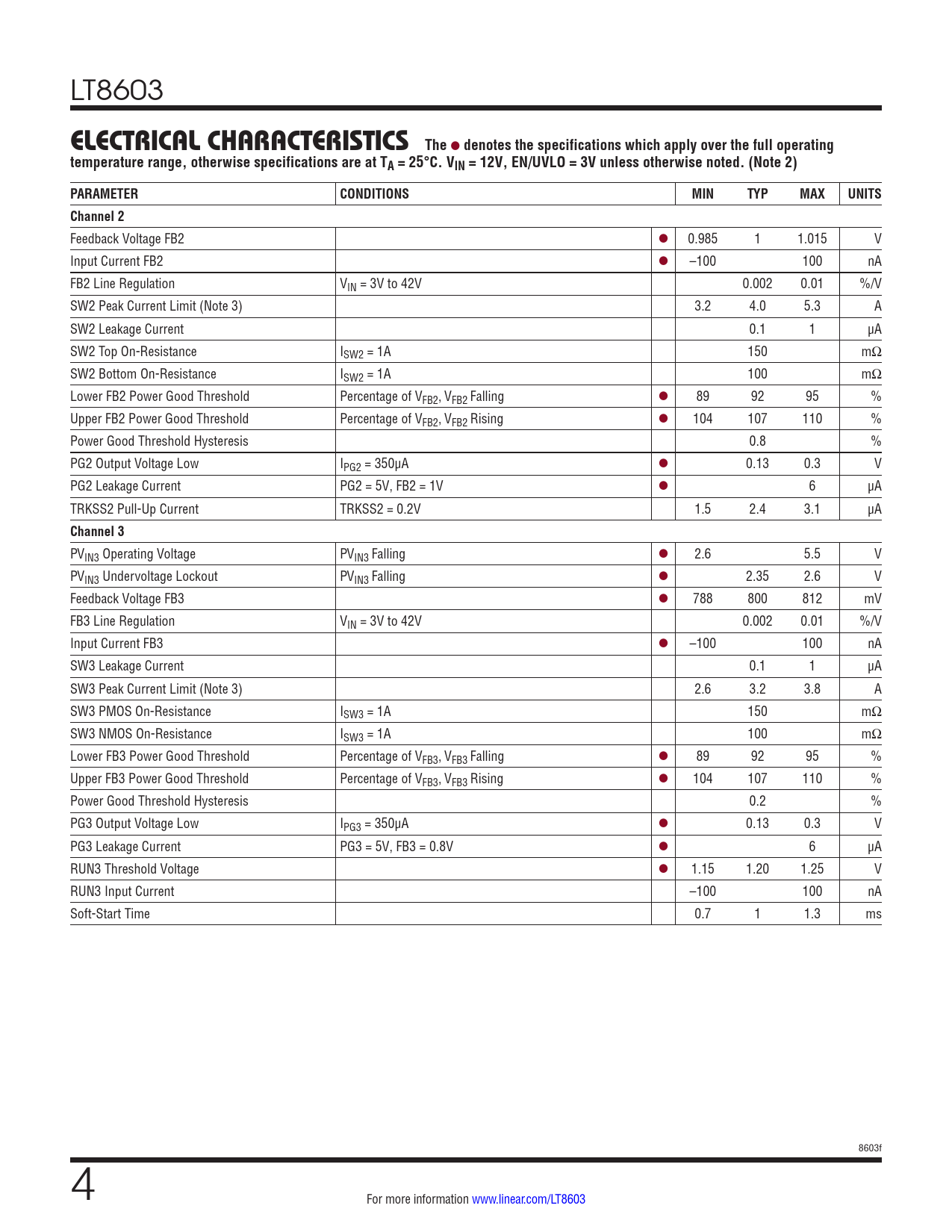 Feedback Voltage FB2 l 0.985 1 1.015 V Input Current FB2 l –100 100 nA FB2 Line Regulation VIN = 3V to 42V 0.002 0.01 %/V SW2 Peak Current Limit (Note 3) 3.2 4.0 5.3 A SW2 Leakage Current 0.1 1 μA SW2 Top On-Resistance ISW2 = 1A 150 mΩ SW2 Bottom On-Resistance ISW2 = 1A 100 mΩ Lower FB2 Power Good Threshold Percentage of VFB2, VFB2 Falling l 89 92 95 % Upper FB2 Power Good Threshold Percentage of VFB2, VFB2 Rising l 104 107 110 % Power Good Threshold Hysteresis 0.8 % PG2 Output Voltage Low IPG2 = 350μA l 0.13 0.3 V PG2 Leakage Current PG2 = 5V, FB2 = 1V l 6 μA TRKSS2 Pull-Up Current TRKSS2 = 0.2V 1.5 2.4 3.1 μA