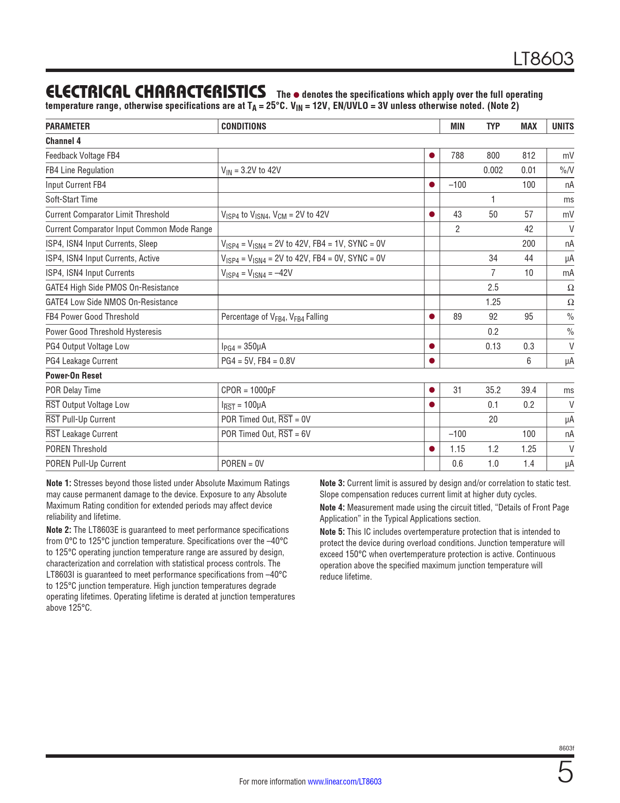 LT8603 ELECTRICAL CHARACTERISTICSThe l denotes the specifications which apply over the full operatingtemperature range, otherwise specifications are at TA = 25°C. VIN = 12V, EN/UVLO = 3V unless otherwise noted. (Note 2)PARAMETERCONDITIONSMINTYPMAXUNITSChannel 4 Feedback Voltage FB4 l 788 800 812 mV FB4 Line Regulation VIN = 3.2V to 42V 0.002 0.01 %/V Input Current FB4 l –100 100 nA Soft-Start Time 1 ms Current Comparator Limit Threshold VISP4 to VISN4, VCM = 2V to 42V l 43 50 57 mV Current Comparator Input Common Mode Range 2 42 V ISP4, ISN4 Input Currents, Sleep VISP4 = VISN4 = 2V to 42V, FB4 = 1V, SYNC = 0V 200 nA ISP4, ISN4 Input Currents, Active VISP4 = VISN4 = 2V to 42V, FB4 = 0V, SYNC = 0V 34 44 μA ISP4, ISN4 Input Currents VISP4 = VISN4 = –42V 7 10 mA GATE4 High Side PMOS On-Resistance 2.5 Ω GATE4 Low Side NMOS On-Resistance 1.25 Ω FB4 Power Good Threshold Percentage of VFB4, VFB4 Falling l 89 92 95 % Power Good Threshold Hysteresis 0.2 % PG4 Output Voltage Low IPG4 = 350μA l 0.13 0.3 V PG4 Leakage Current PG4 = 5V, FB4 = 0.8V l 6 μA Power-On Reset POR Delay Time CPOR = 1000pF l 31 35.2 39.4 ms RST Output Voltage Low IRST = 100μA l 0.1 0.2 V RST Pull-Up Current POR Timed Out, RST = 0V 20 μA RST Leakage Current POR Timed Out, RST = 6V –100 100 nA POREN Threshold l 1.15 1.2 1.25 V POREN Pull-Up Current POREN = 0V 0.6 1.0 1.4 μA Note 1: Stresses beyond those listed under Absolute Maximum Ratings Note 3: Current limit is assured by design and/or correlation to static test. may cause permanent damage to the device. Exposure to any Absolute Slope compensation reduces current limit at higher duty cycles. Maximum Rating condition for extended periods may affect device Note 4: Measurement made using the circuit titled, “Details of Front Page reliability and lifetime. Application” in the Typical Applications section. Note 2: The LT8603E is guaranteed to meet performance specifications Note 5: This IC includes overtemperature protection that is intended to from 0°C to 125°C junction temperature. Specifications over the –40°C protect the device during overload conditions. Junction temperature will to 125°C operating junction temperature range are assured by design, exceed 150°C when overtemperature protection is active. Continuous characterization and correlation with statistical process controls. The operation above the specified maximum junction temperature will LT8603I is guaranteed to meet performance specifications from –40°C reduce lifetime. to 125°C junction temperature. High junction temperatures degrade operating lifetimes. Operating lifetime is derated at junction temperatures above 125°C. 8603f For more information www.linear.com/LT8603 5 Document Outline Features Applications Typical Application Description Absolute Maximum Ratings Order Information Pin Configuration Electrical Characteristics Typical Performance Characteristics Pin Functions Block Diagram Operation Applications Information System Architecture Boost Controller Buck Regulators General Functions PCB Layout Thermal Considerations Typical Applications Package Description Typical Application Related Parts