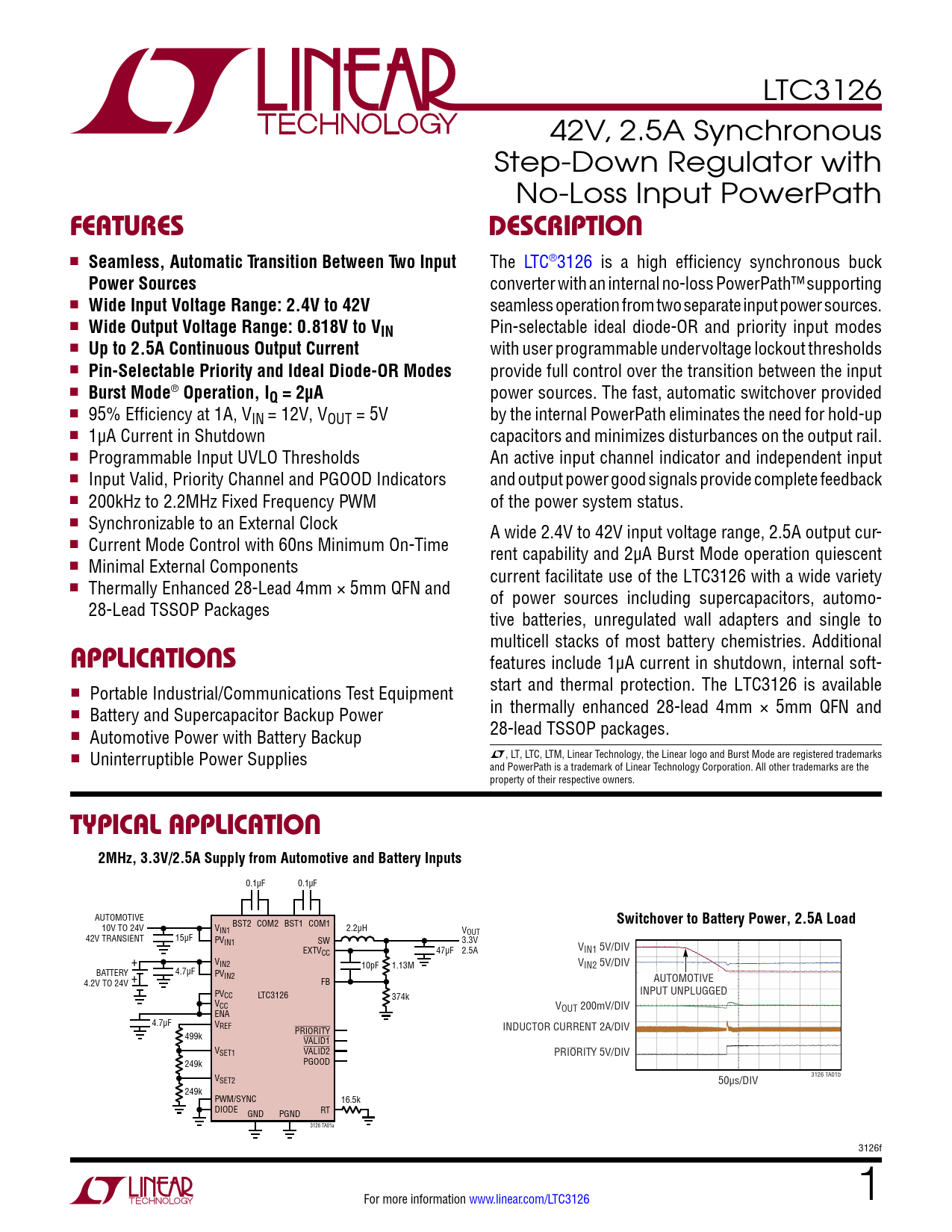 LTC3126 42V, 2.5A Synchronous Step-Down Regulator with No-Loss Input PowerPath FeaTuresDescripTion n Seamless, Automatic Transition Between Two Input The LTC®3126 is a high efficiency synchronous buck Power Sources converter with an internal no-loss PowerPath™ supporting n Wide Input Voltage Range: 2.4V to 42V seamless operation from two separate input power sources. n Wide Output Voltage Range: 0.818V to VIN Pin-selectable ideal diode-OR and priority input modes n Up to 2.5A Continuous Output Current with user programmable undervoltage lockout thresholds n Pin-Selectable Priority and Ideal Diode-OR Modes provide full control over the transition between the input n Burst Mode ® Operation, IQ = 2µA power sources. The fast, automatic switchover provided n 95% Efficiency at 1A, VIN = 12V, VOUT = 5V by the internal PowerPath eliminates the need for hold-up n 1µA Current in Shutdown capacitors and minimizes disturbances on the output rail. n Programmable Input UVLO Thresholds An active input channel indicator and independent input n Input Valid, Priority Channel and PGOOD Indicators and output power good signals provide complete feedback n 200kHz to 2.2MHz Fixed Frequency PWM of the power system status. n Synchronizable to an External Clock A wide 2.4V to 42V input voltage range, 2.5A output cur- n Current Mode Control with 60ns Minimum On-Time rent capability and 2µA Burst Mode operation quiescent n Minimal External Components current facilitate use of the LTC3126 with a wide variety n Thermally Enhanced 28-Lead 4mm × 5mm QFN and of power sources including supercapacitors, automo- 28-Lead TSSOP Packages tive batteries, unregulated wall adapters and single to multicell stacks of most battery chemistries. Additional applicaTions features include 1µA current in shutdown, internal soft- n start and thermal protection. The LTC3126 is available Portable Industrial/Communications Test Equipment n in thermally enhanced 28-lead 4mm × 5mm QFN and Battery and Supercapacitor Backup Power n 28-lead TSSOP packages. Automotive Power with Battery Backup n Uninterruptible Power Supplies L, LT, LTC, LTM, Linear Technology, the Linear logo and Burst Mode are registered trademarks and PowerPath is a trademark of Linear Technology Corporation. All other trademarks are the property of their respective owners. Typical applicaTion2MHz, 3.3V/2.5A Supply from Automotive and Battery Inputs 0.1µF 0.1µF AUTOMOTIVE Switchover to Battery Power, 2.5A Load 10V TO 24V V BST2 COM2 BST1 COM1 IN1 2.2µH VOUT 42V TRANSIENT 15µF PVIN1 SW 3.3V EXTV V CC 47µF 2.5A IN1 5V/DIV + VIN2 10pF 1.13M VIN2 5V/DIV BATTERY 4.7µF PVIN2 4.2V TO 24V + FB AUTOMOTIVE PV INPUT UNPLUGGED CC LTC3126 374k VCC V ENA OUT 200mV/DIV 4.7µF VREF PRIORITY INDUCTOR CURRENT 2A/DIV 499k VALID1 VSET1 VALID2 PRIORITY 5V/DIV PGOOD 249k V 3126 TA01b SET2 50µs/DIV 249k PWM/SYNC 16.5k DIODE RT GND PGND 3126 TA01a 3126f For more information www.linear.com/LTC3126 1 Document Outline Features Applications Description Typical Application Absolute Maximum Ratings Pin Configuration Order Information Electrical Characteristics Typical Performance Characteristics Pin Functions Block Diagram Quick Reference Operation Applications Information Typical Applications Package Description Typical Application Related Parts