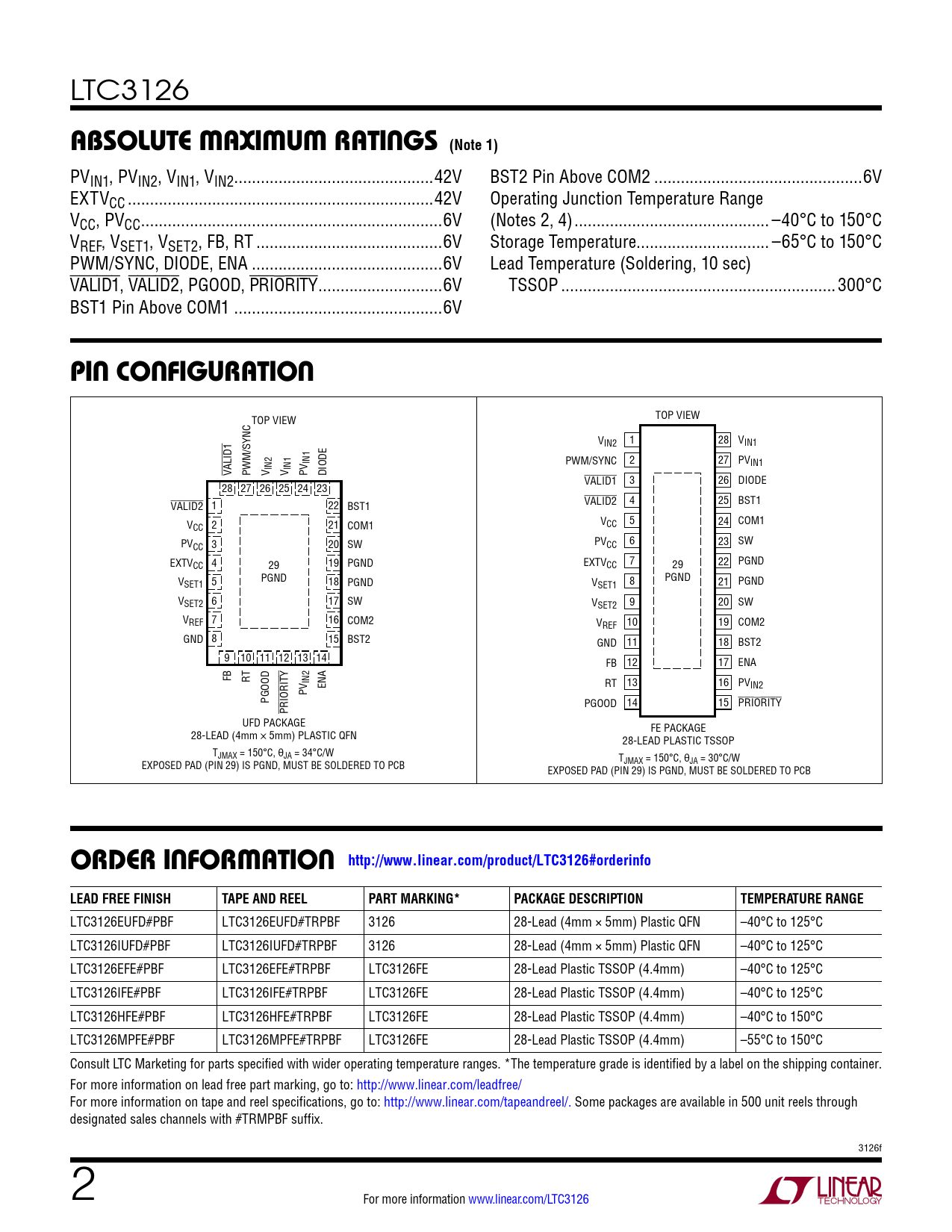 absoluTe MaxiMuM raTings (Note 1). pin conFiguraTion. orDer inForMaTion http://www.linear.com/product/LTC3126#orderinfo