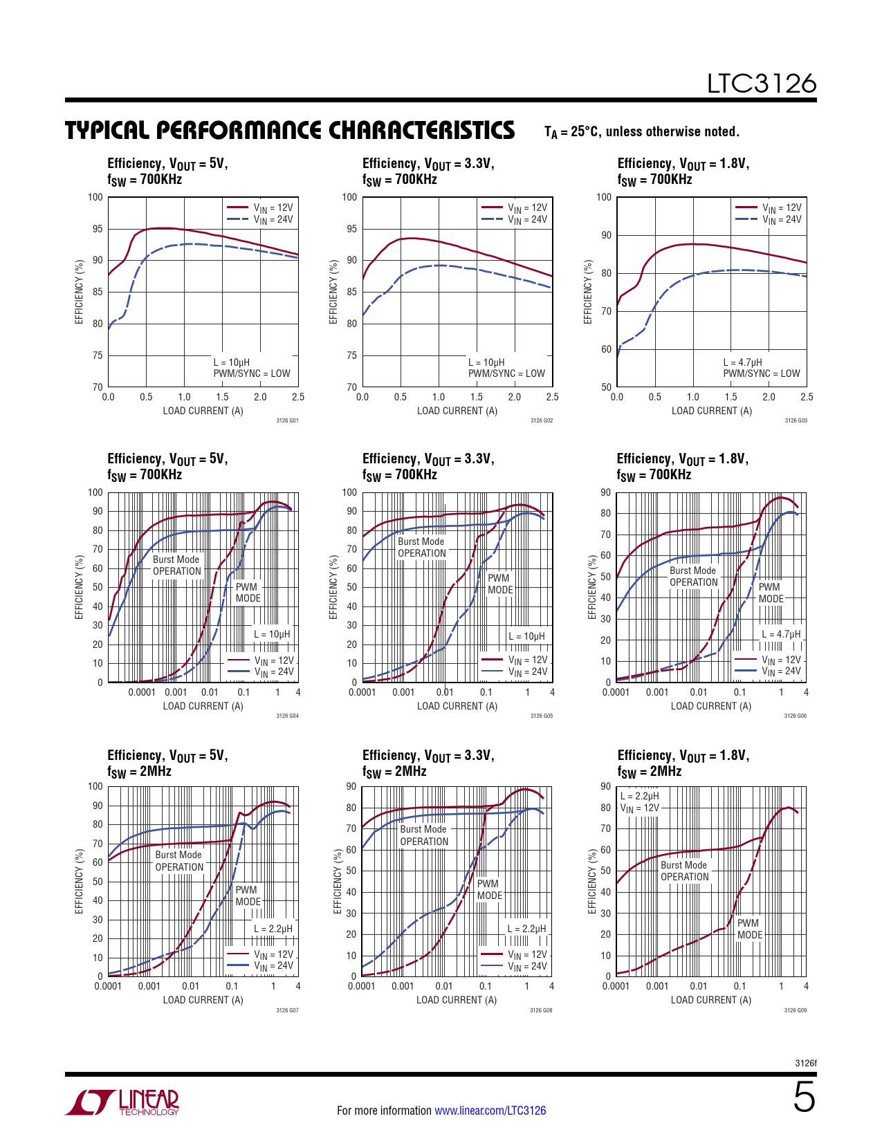 100 100 100 VIN = 12V VIN = 12V VIN = 12V VIN = 24V VIN = 24V VIN = 24V 95 95 90 90 90 80 85 85 70 EFFICIENCY (%) 80 EFFICIENCY (%) 80 EFFICIENCY (%) 60 75 75 L = 10µH L = 10µH L = 4.7µH PWM/SYNC = LOW PWM/SYNC = LOW PWM/SYNC = LOW 70 70 50 0.0 0.5 1.0 1.5 2.0 2.5 0.0 0.5 1.0 1.5 2.0 2.5 0.0 0.5 1.0 1.5 2.0 2.5 LOAD CURRENT (A) LOAD CURRENT (A) LOAD CURRENT (A) 3126 G01 3126 G02 3126 G03