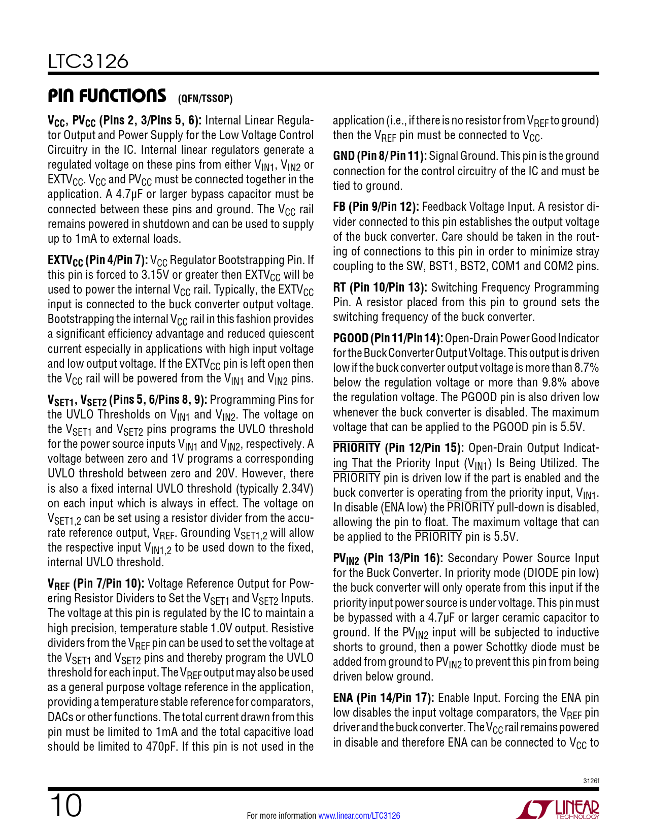 pin FuncTions (QFN/TSSOP) VCC, PVCC (Pins 2, 3/Pins 5, 6):. GND (Pin 8/ Pin 11):. FB (Pin 9/Pin 12):. EXTVCC (Pin 4/Pin 7):