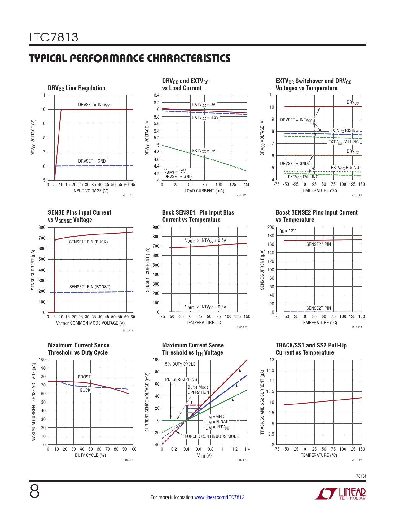 11 6.4 11 DRVSET = INTV 6.2 DRVCC CC EXTVCC = 0V 10 6 10 5.8 EXTVCC = 8.5V 9 DRVSET = INTV 9 5.6 CC 5.4 EXTV TAGE (V) TAGE (V) TAGE (V) 8 CC RISING 8 5.2 VOL VOL VOL 7 EXTVCC FALLING CC CC 5 CC EXTV DRV DRV 7 DRV 4.8 CC = 5V DRV CC 6 DRVSET = GND 4.6 6 4.4 DRVSET = GND 5 EXTVCC RISING 4.2 VBIAS = 12V DRVSET = GND EXTV 5 4 4 CC FALLING 0 5 10 15 20 25 30 35 40 45 50 55 60 65 0 25 50 75 100 125 150 -75 -50 -25 0 25 50 75 100 125 150 INPUT VOLTAGE (V) LOAD CURRENT (mA) TEMPERATURE (°C) 7813 G19 7813 G20 7813 G21