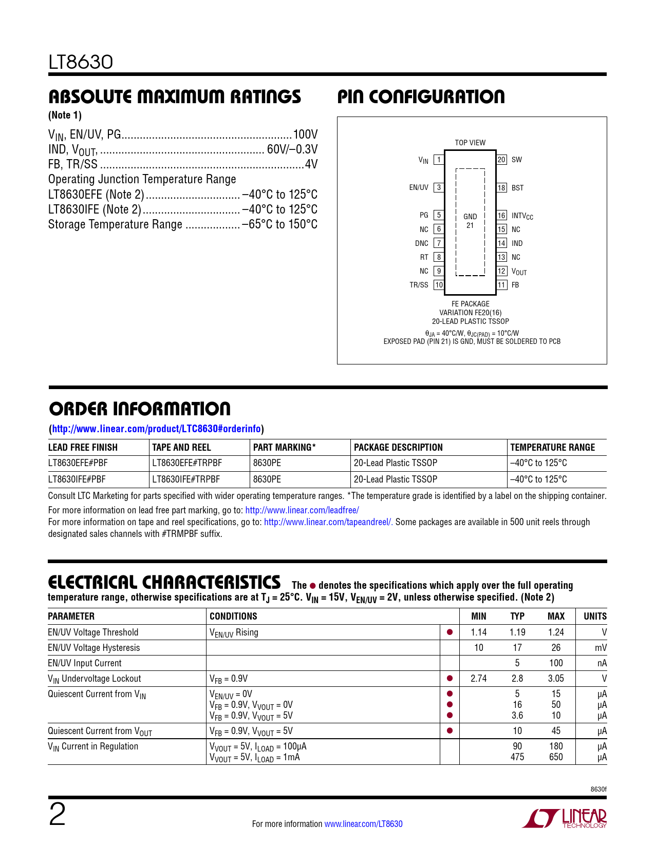 VIN, EN/UV, PG ..100V TOP VIEW IND, VOUT, .. 60V/–0.3V VIN 1 20 SW FB, TR/SS ...4V Operating Junction Temperature Range EN/UV 3 18 BST LT8630EFE (Note 2) ... –40°C to 125°C LT8630IFE (Note 2) .. –40°C to 125°C PG 5 GND 16 INTVCC Storage Temperature Range .. –65°C to 150°C NC 6 21 15 NC DNC 7 14 IND RT 8 13 NC NC 9 12 VOUT TR/SS 10 11 FB FE PACKAGE VARIATION FE20(16) 20-LEAD PLASTIC TSSOP θJA = 40°C/W, θJC(PAD) = 10°C/W EXPOSED PAD (PIN 21) IS GND, MUST BE SOLDERED TO PCB