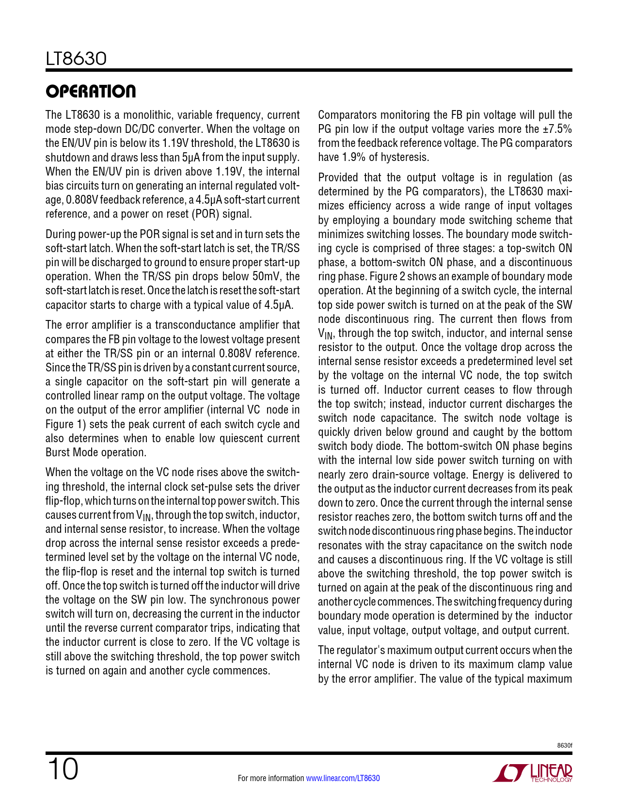 LT8630 operaTion The LT8630 is a monolithic, variable frequency, current Comparators monitoring the FB pin voltage will pull the mode step-down DC/DC converter. When the voltage on PG pin low if the output voltage varies more the ±7.5% the EN/UV pin is below its 1.19V threshold, the LT8630 is from the feedback reference voltage. The PG comparators shutdown and draws less than 5µA from the input supply. have 1.9% of hysteresis. When the EN/UV pin is driven above 1.19V, the internal Provided that the output voltage is in regulation (as bias circuits turn on generating an internal regulated volt- determined by the PG comparators), the LT8630 maxi- age, 0.808V feedback reference, a 4.5µA soft-start current mizes efficiency across a wide range of input voltages reference, and a power on reset (POR) signal. by employing a boundary mode switching scheme that During power-up the POR signal is set and in turn sets the minimizes switching losses. The boundary mode switch- soft-start latch. When the soft-start latch is set, the TR/SS ing cycle is comprised of three stages: a top-switch ON pin will be discharged to ground to ensure proper start-up phase, a bottom-switch ON phase, and a discontinuous operation. When the TR/SS pin drops below 50mV, the ring phase. Figure 2 shows an example of boundary mode soft-start latch is reset. Once the latch is reset the soft-start operation. At the beginning of a switch cycle, the internal capacitor starts to charge with a typical value of 4.5µA. top side power switch is turned on at the peak of the SW node discontinuous ring. The current then flows from The error amplifier is a transconductance amplifier that VIN, through the top switch, inductor, and internal sense compares the FB pin voltage to the lowest voltage present resistor to the output. Once the voltage drop across the at either the TR/SS pin or an internal 0.808V reference. internal sense resistor exceeds a predetermined level set Since the TR/SS pin is driven by a constant current source, by the voltage on the internal VC node, the top switch a single capacitor on the soft-start pin will generate a is turned off. Inductor current ceases to flow through controlled linear ramp on the output voltage. The voltage the top switch; instead, inductor current discharges the on the output of the error amplifier (internal VC node in switch node capacitance. The switch node voltage is Figure 1) sets the peak current of each switch cycle and quickly driven below ground and caught by the bottom also determines when to enable low quiescent current switch body diode. The bottom-switch ON phase begins Burst Mode operation. with the internal low side power switch turning on with When the voltage on the VC node rises above the switch- nearly zero drain-source voltage. Energy is delivered to ing threshold, the internal clock set-pulse sets the driver the output as the inductor current decreases from its peak flip-flop, which turns on the internal top power switch. This down to zero. Once the current through the internal sense causes current from VIN, through the top switch, inductor, resistor reaches zero, the bottom switch turns off and the and internal sense resistor, to increase. When the voltage switch node discontinuous ring phase begins. The inductor drop across the internal sense resistor exceeds a prede- resonates with the stray capacitance on the switch node termined level set by the voltage on the internal VC node, and causes a discontinuous ring. If the VC voltage is still the flip-flop is reset and the internal top switch is turned above the switching threshold, the top power switch is off. Once the top switch is turned off the inductor will drive turned on again at the peak of the discontinuous ring and the voltage on the SW pin low. The synchronous power another cycle commences. The switching frequency during switch will turn on, decreasing the current in the inductor boundary mode operation is determined by the inductor until the reverse current comparator trips, indicating that value, input voltage, output voltage, and output current. the inductor current is close to zero. If the VC voltage is The regulator's maximum output current occurs when the still above the switching threshold, the top power switch internal VC node is driven to its maximum clamp value is turned on again and another cycle commences. by the error amplifier. The value of the typical maximum 8630f 10 For more information www.linear.com/LT8630 Document Outline Features Description Applications Typical Application Absolute Maximum Ratings Pin Configuration Order Information Electrical Characteristics Typical Performance Characteristics Pin Functions Block Diagram Operation Applications Information Typical Applications Package Description Typical Application Related Parts