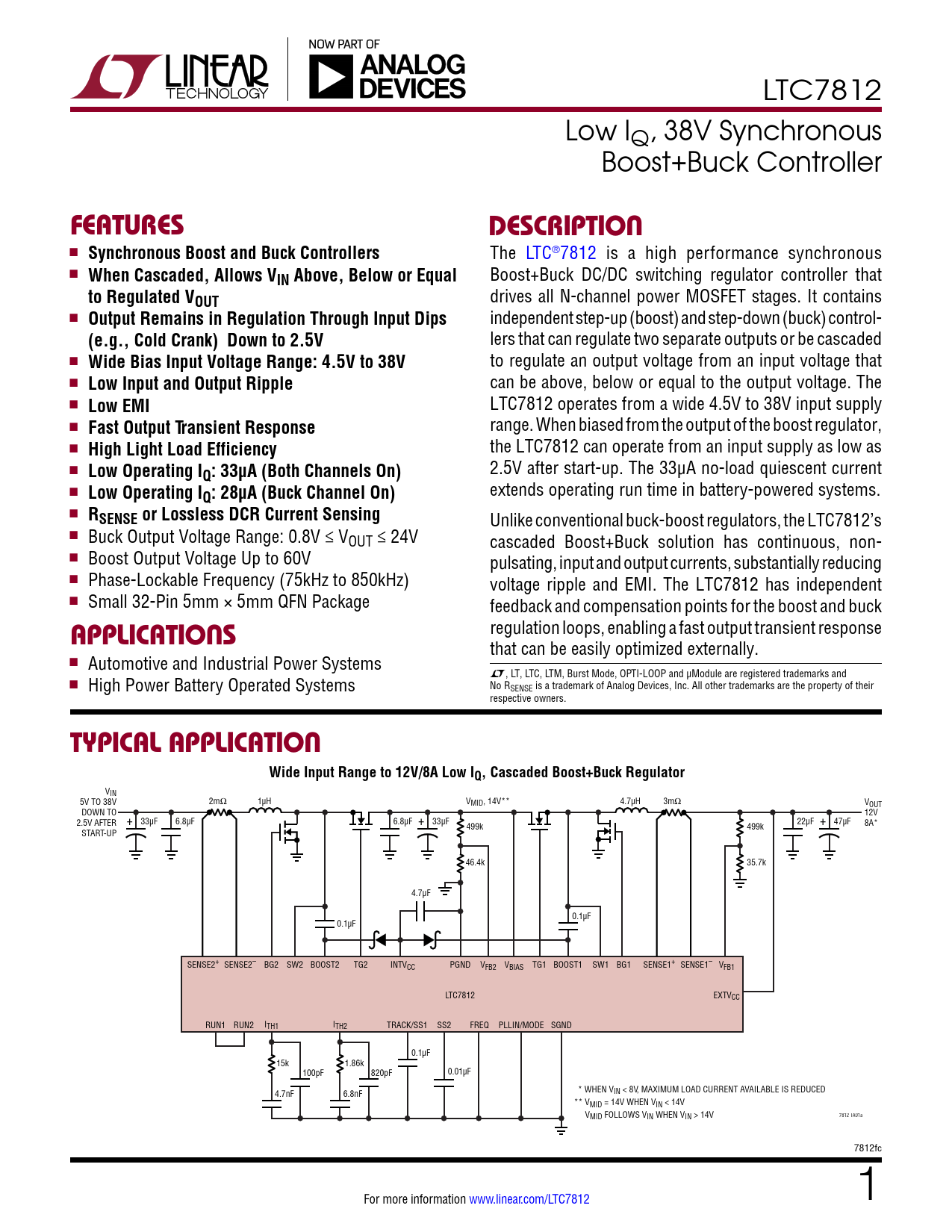 LTC7812 Low IQ, 38V Synchronous Boost+Buck Controller FEATURESDESCRIPTION n Synchronous Boost and Buck Controllers The LTC®7812 is a high performance synchronous n When Cascaded, Allows VIN Above, Below or Equal Boost+Buck DC/DC switching regulator controller that to Regulated VOUT drives all N-channel power MOSFET stages. It contains n Output Remains in Regulation Through Input Dips independent step-up (boost) and step-down (buck) control- (e.g., Cold Crank) Down to 2.5V lers that can regulate two separate outputs or be cascaded n Wide Bias Input Voltage Range: 4.5V to 38V to regulate an output voltage from an input voltage that n Low Input and Output Ripple can be above, below or equal to the output voltage. The n Low EMI LTC7812 operates from a wide 4.5V to 38V input supply n Fast Output Transient Response range. When biased from the output of the boost regulator, n High Light Load Efficiency the LTC7812 can operate from an input supply as low as n Low Operating I 2.5V after start-up. The 33μA no-load quiescent current Q: 33µA (Both Channels On) n Low Operating I extends operating run time in battery-powered systems. Q: 28µA (Buck Channel On) n RSENSE or Lossless DCR Current Sensing Unlike conventional buck-boost regulators, the LTC7812’s n Buck Output Voltage Range: 0.8V ≤ VOUT ≤ 24V cascaded Boost+Buck solution has continuous, non- n Boost Output Voltage Up to 60V pulsating, input and output currents, substantially reducing n Phase-Lockable Frequency (75kHz to 850kHz) voltage ripple and EMI. The LTC7812 has independent n Small 32-Pin 5mm × 5mm QFN Package feedback and compensation points for the boost and buck regulation loops, enabling a fast output transient response APPLICATIONS that can be easily optimized externally. n Automotive and Industrial Power Systems L, LT, LTC, LTM, Burst Mode, OPTI-LOOP and µModule are registered trademarks and n High Power Battery Operated Systems No RSENSE is a trademark of Analog Devices, Inc. All other trademarks are the property of their respective owners. TYPICAL APPLICATIONWide Input Range to 12V/8A Low IQ, Cascaded Boost+Buck Regulator VIN 5V TO 38V 2mΩ 1µH VMID, 14V** 4.7µH 3mΩ VOUT DOWN TO 12V 2.5V AFTER + 33µF 6.8µF 6.8µF + 33µF 22µF + 47µF 8A* 499k 499k START-UP 46.4k 35.7k 4.7µF 0.1µF 0.1µF SENSE2– SENSE2+ BG2 SW2 BOOST2 TG2 INTVCC PGND VFB2 VBIAS TG1 BOOST1 SW1 BG1 SENSE1+ SENSE1– VFB1 LTC7812 EXTVCC RUN1 RUN2 ITH1 ITH2 TRACK/SS1 SS2 FREQ PLLIN/MODE SGND 0.1µF 15k 1.86k 100pF 820pF 0.01µF 4.7nF 6.8nF * WHEN VIN < 8V, MAXIMUM LOAD CURRENT AVAILABLE IS REDUCED ** VMID = 14V WHEN VIN < 14V V 7812 TA01a MID FOLLOWS VIN WHEN VIN > 14V 7812fc For more information www.linear.com/LTC7812 1 Document Outline Features Applications Description Typical Application Absolute Maximum Ratings Pin Configuration Order Information Electrical Characteristics Typical Performance Characteristics Pin Functions Functional Diagram Operation Applications Information Typical Applications Typical Application Related Parts