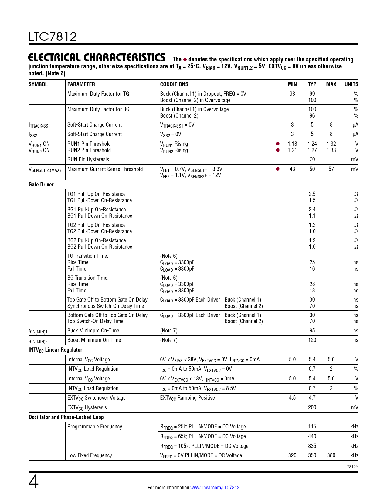 Programmable Frequency RFREQ = 25k; PLLIN/MODE = DC Voltage 115 kHz RFREQ = 65k; PLLIN/MODE = DC Voltage 440 kHz RFREQ = 105k; PLLIN/MODE = DC Voltage 835 kHz Low Fixed Frequency VFREQ = 0V PLLIN/MODE = DC Voltage 320 350 380 kHz 7812fc 4 For more information www.linear.com/LTC7812 Document Outline Features Applications Description Typical Application Absolute Maximum Ratings Pin Configuration Order Information Electrical Characteristics Typical Performance Characteristics Pin Functions Functional Diagram Operation Applications Information Typical Applications Typical Application Related Parts