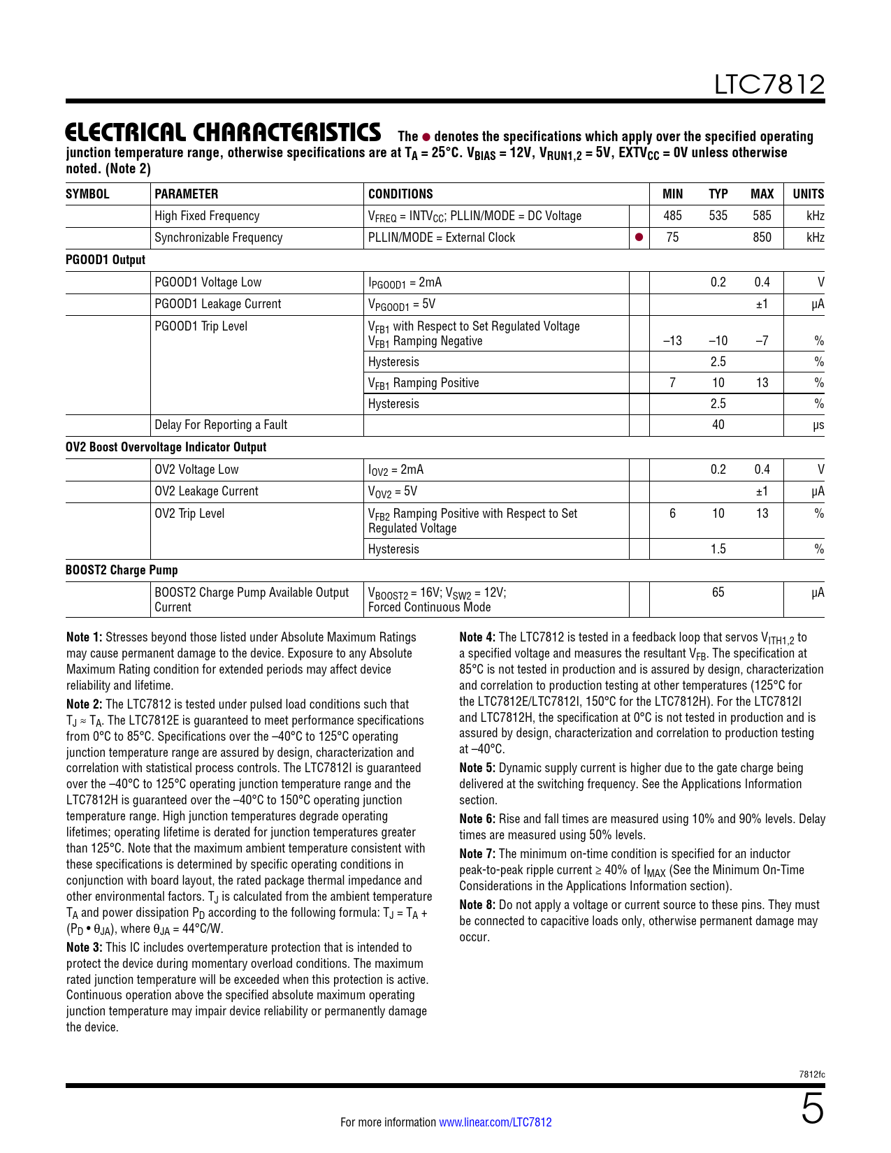 The LTC7812 is tested under pulsed load conditions such that the LTC7812E/LTC7812I, 150°C for the LTC7812H). For the LTC7812I T and LTC7812H, the specification at 0°C is not tested in production and is J ≈ TA. The LTC7812E is guaranteed to meet performance specifications from 0°C to 85°C. Specifications over the –40°C to 125°C operating assured by design, characterization and correlation to production testing junction temperature range are assured by design, characterization and at –40°C. correlation with statistical process controls. The LTC7812I is guaranteed
