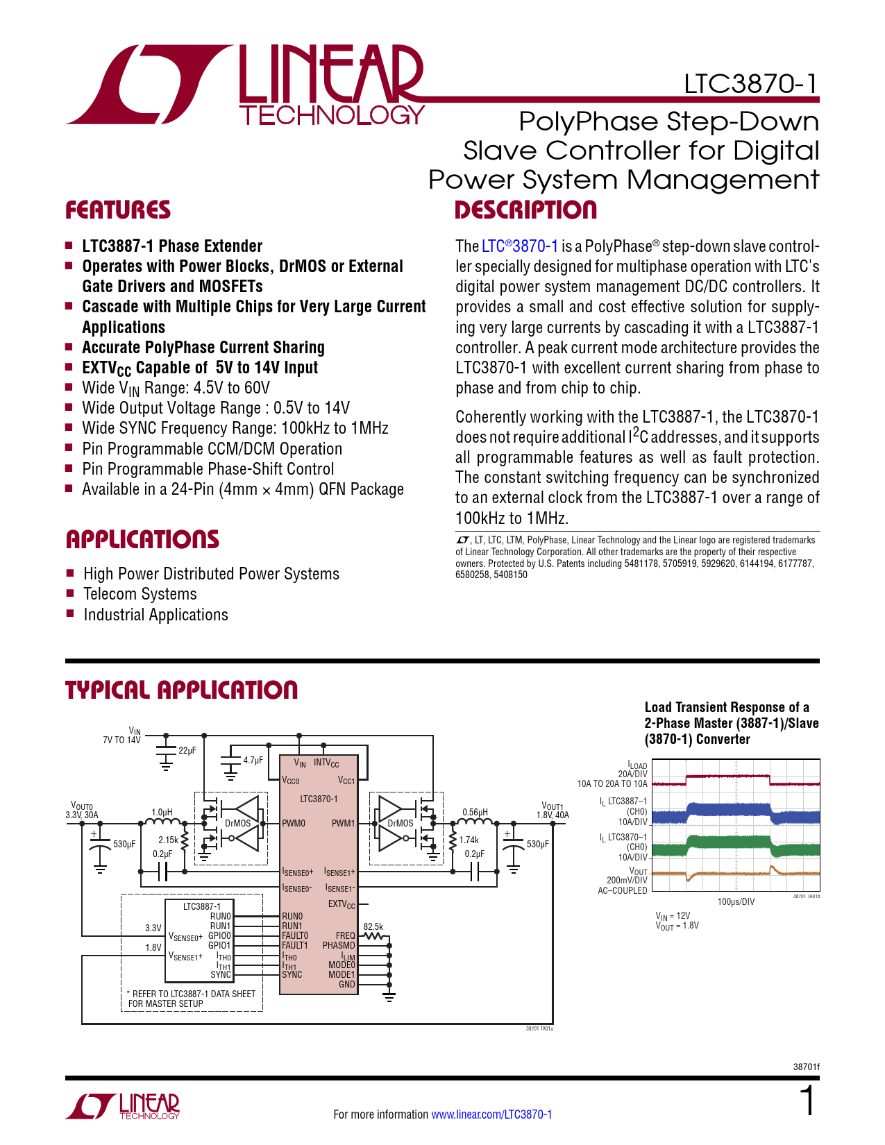 LTC3870-1 PolyPhase Step-Down Slave Controller for Digital Power System Management FeaTuresDescripTion n LTC3887-1 Phase Extender The LTC®3870-1 is a PolyPhase® step-down slave control- n Operates with Power Blocks, DrMOS or External ler specially designed for multiphase operation with LTC's Gate Drivers and MOSFETs digital power system management DC/DC controllers. It n Cascade with Multiple Chips for Very Large Current provides a small and cost effective solution for supply- Applications ing very large currents by cascading it with a LTC3887-1 n Accurate PolyPhase Current Sharing controller. A peak current mode architecture provides the n EXTVCC Capable of 5V to 14V Input LTC3870-1 with excellent current sharing from phase to n Wide VIN Range: 4.5V to 60V phase and from chip to chip. n Wide Output Voltage Range : 0.5V to 14V Coherently working with the LTC3887-1, the LTC3870-1 n Wide SYNC Frequency Range: 100kHz to 1MHz does not require additional I2C addresses, and it supports n Pin Programmable CCM/DCM Operation all programmable features as well as fault protection. n Pin Programmable Phase-Shift Control The constant switching frequency can be synchronized n Available in a 24-Pin (4mm × 4mm) QFN Package to an external clock from the LTC3887-1 over a range of 100kHz to 1MHz. applicaTions L, LT, LTC, LTM, PolyPhase, Linear Technology and the Linear logo are registered trademarks of Linear Technology Corporation. All other trademarks are the property of their respective owners. Protected by U.S. Patents including 5481178, 5705919, 5929620, 6144194, 6177787, n High Power Distributed Power Systems 6580258, 5408150 n Telecom Systems n Industrial Applications Typical applicaTionLoad Transient Response of a2-Phase Master (3887-1)/Slave VIN 7V TO 14V (3870-1) Converter 22µF 4.7µF VIN INTVCC ILOAD 20A/DIV VCC0 VCC1 10A TO 20A TO 10A LTC3870-1 V I OUT0 V L LTC3887–1 1.0µH 0.56µH OUT1 3.3V, 30A 1.8V, 40A (CH0) DrMOS PWM0 PWM1 DrMOS 10A/DIV 2.15k 1.74k I 530µF 530µF L LTC3870–1 (CH0) 0.2µF 0.2µF 10A/DIV ISENSE0+ ISENSE1+ VOUT 200mV/DIV ISENSE0- ISENSE1- AC–COUPLED 38701 TA01b EXTV LTC3887-1 100µs/DIV CC RUN0 RUN0 VIN = 12V RUN1 RUN1 3.3V 82.5k VOUT = 1.8V VSENSE0+ GPIO0 FAULT0 FREQ GPIO1 FAULT1 PHASMD 1.8V VSENSE1+ ITH0 ITH0 ILIM ITH1 ITH1 MODE0 SYNC SYNC MODE1 GND * REFER TO LTC3887-1 DATA SHEET FOR MASTER SETUP 38701 TA01a 38701f For more information www.linear.com/LTC3870-1 1 Document Outline Features Applications Typical Application Description Absolute Maximum Ratings Order Information Electrical Characteristics Pin Configuration Typical Performance Characteristics Pin Functions Block Diagram Operation Applications Information Typical Applications Package Description Typical Application Related Parts
